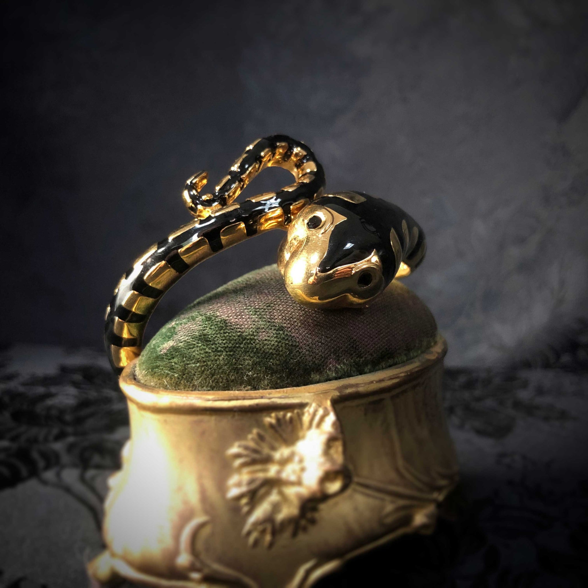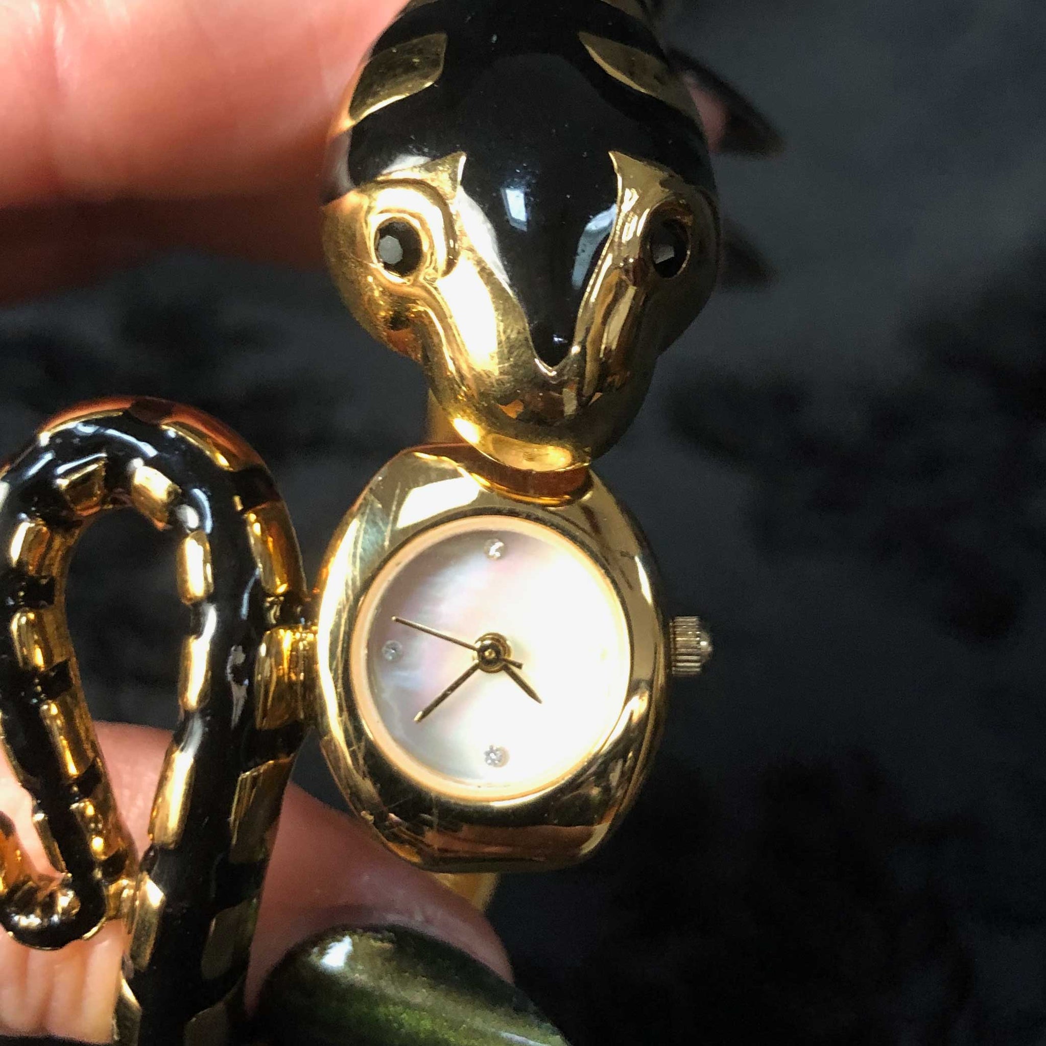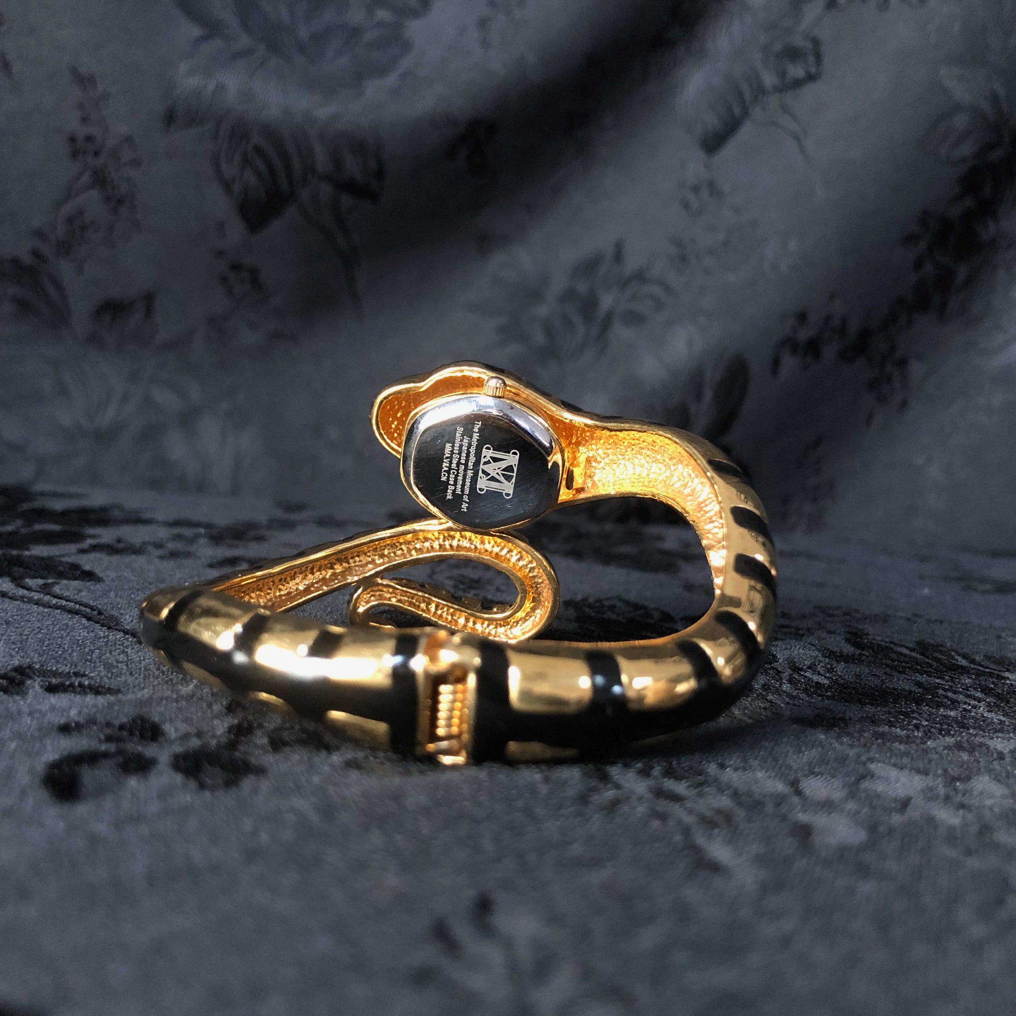Keep the time like Cleopatra with a snake bracelet hiding a secret watch. Black enamel stripes and bright gold finish make a dramatic contrast on this slithering snake form. Lift the head to discover a watch face in Mother of Pearl and crystal primary hours.