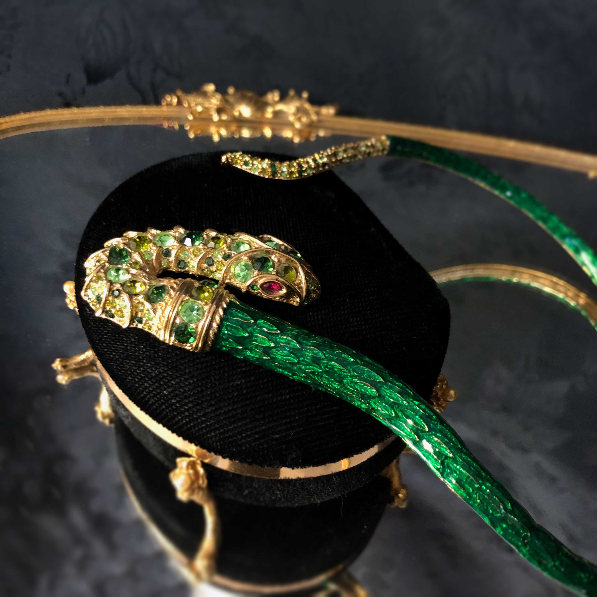 A slithering emerald green serpent with red eyes to keep watch over your heart.