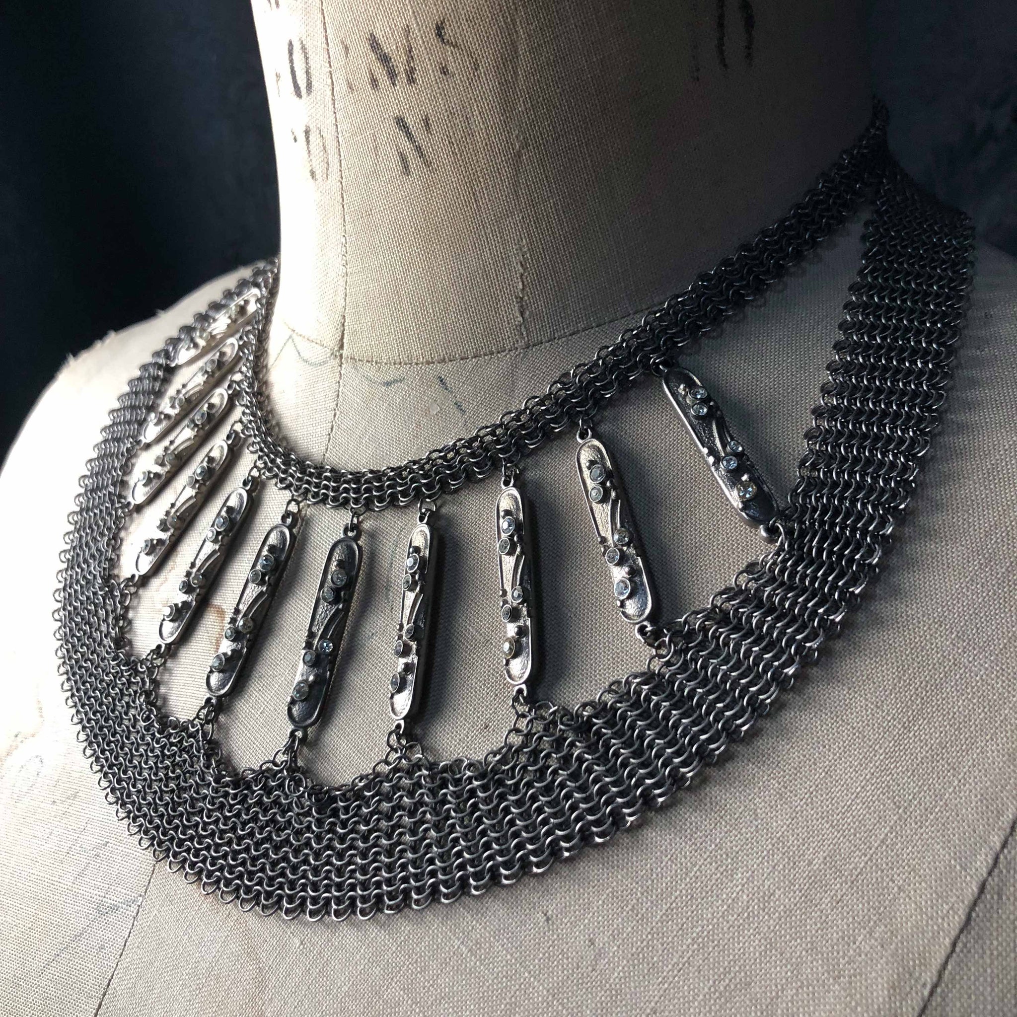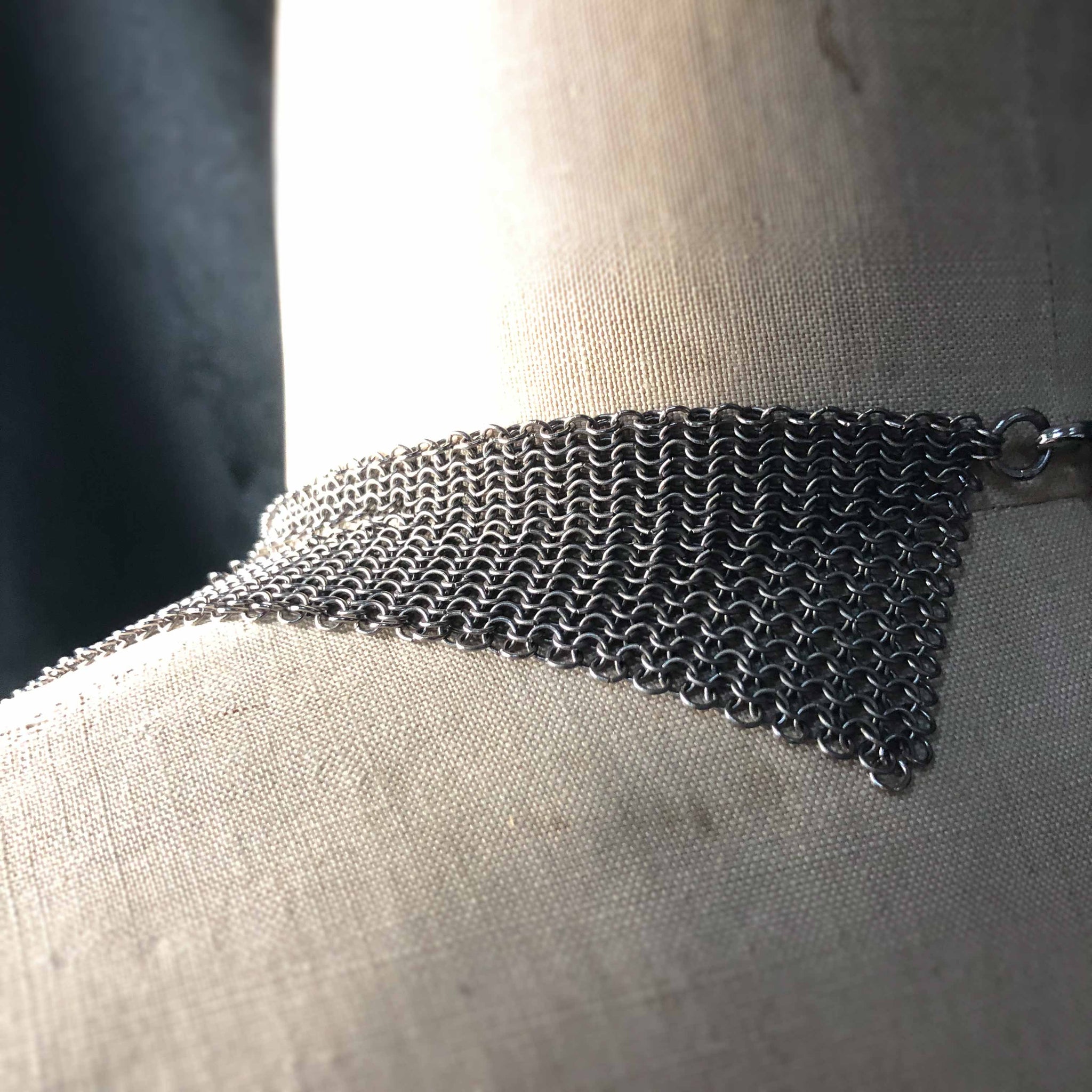 To be wrapped in the luxurious drape of this mesh collar is like being in the warmth of Mother Spider's cozy web. The chain mail lays on your skin like a dream. And tiny sparkles glitter like dew on a morning web.