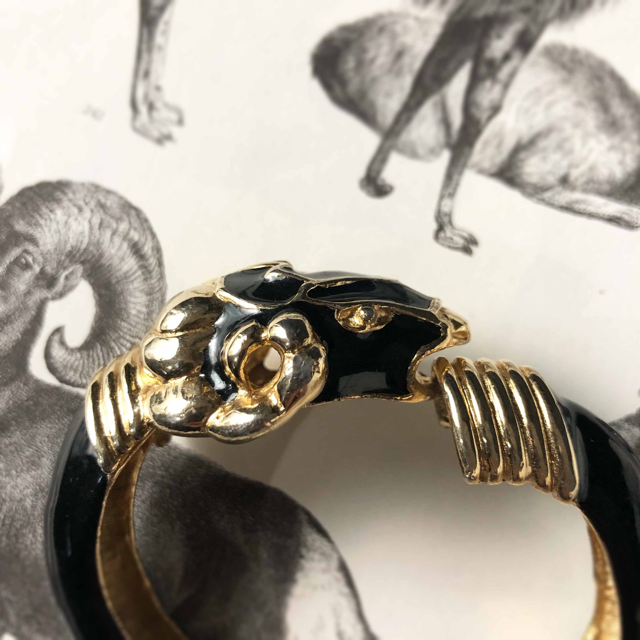 Vintage cold enamel and gold plated metal. Made by Donald Stannard. As it sits with mouth to end, the inner circumference measures 6.5 inches, with room to expand to 7 if you don't mind a snug fit. The head is 1.25" wide. The enamel finish is in very good condition, with some wear but no chips. The gold plating is worn at the horns and edges. Horns on one side have a bit of wear to the underlying metal. This guy was well loved! A very charming fellow.