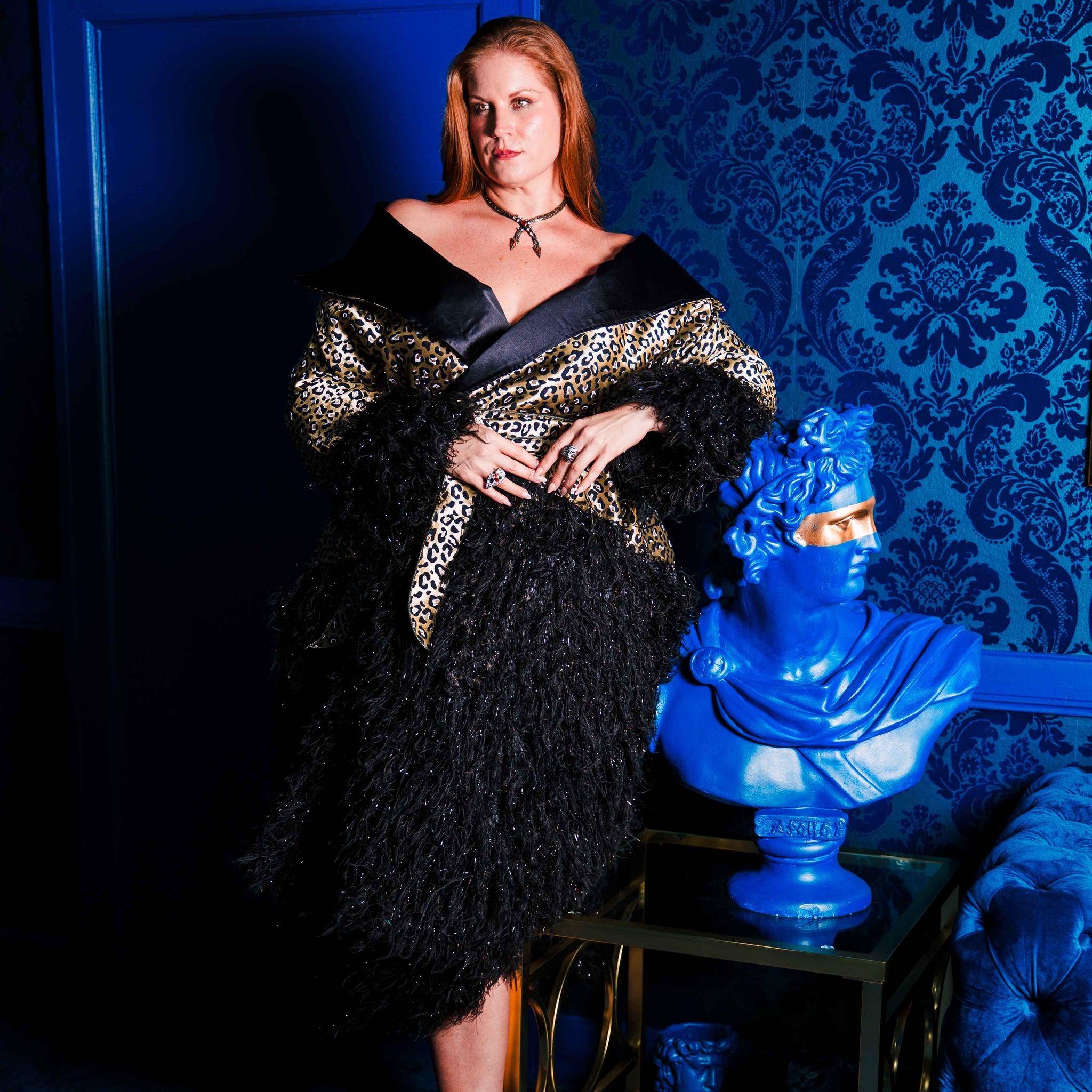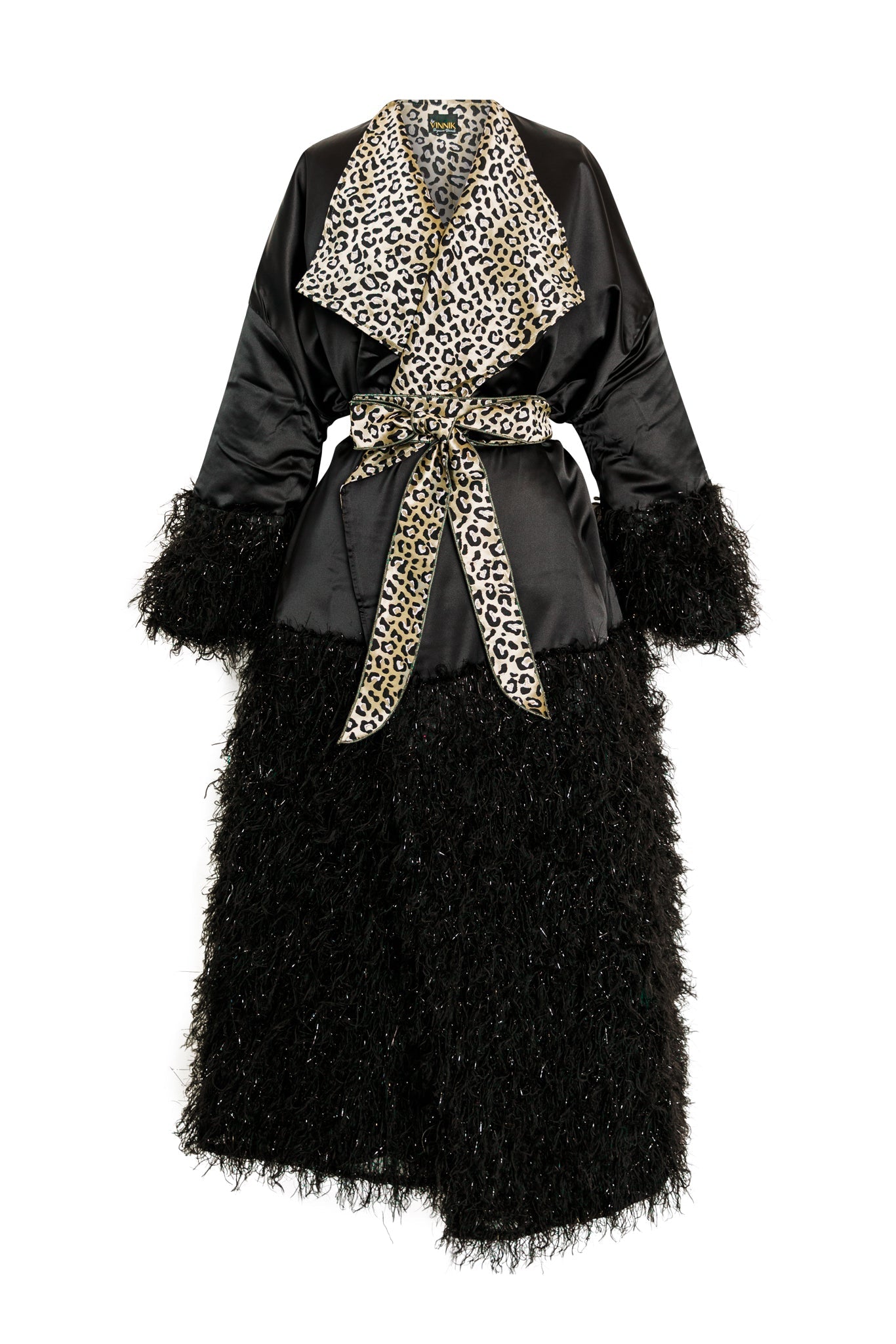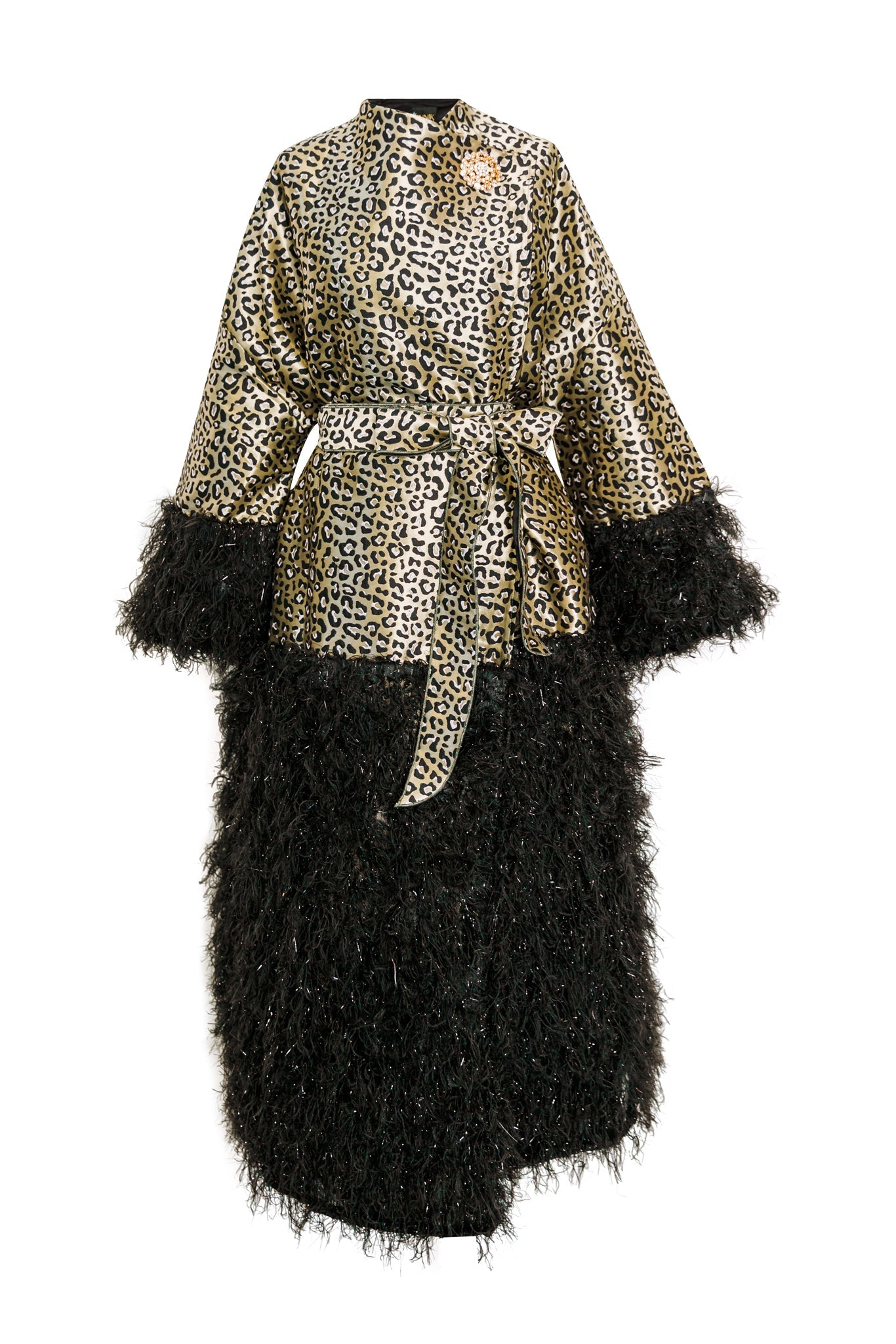 - byVINNIK opera coat in Jacquard (may contain metallic) with Satin lining and Mesh trim with long pile shag and tinsel