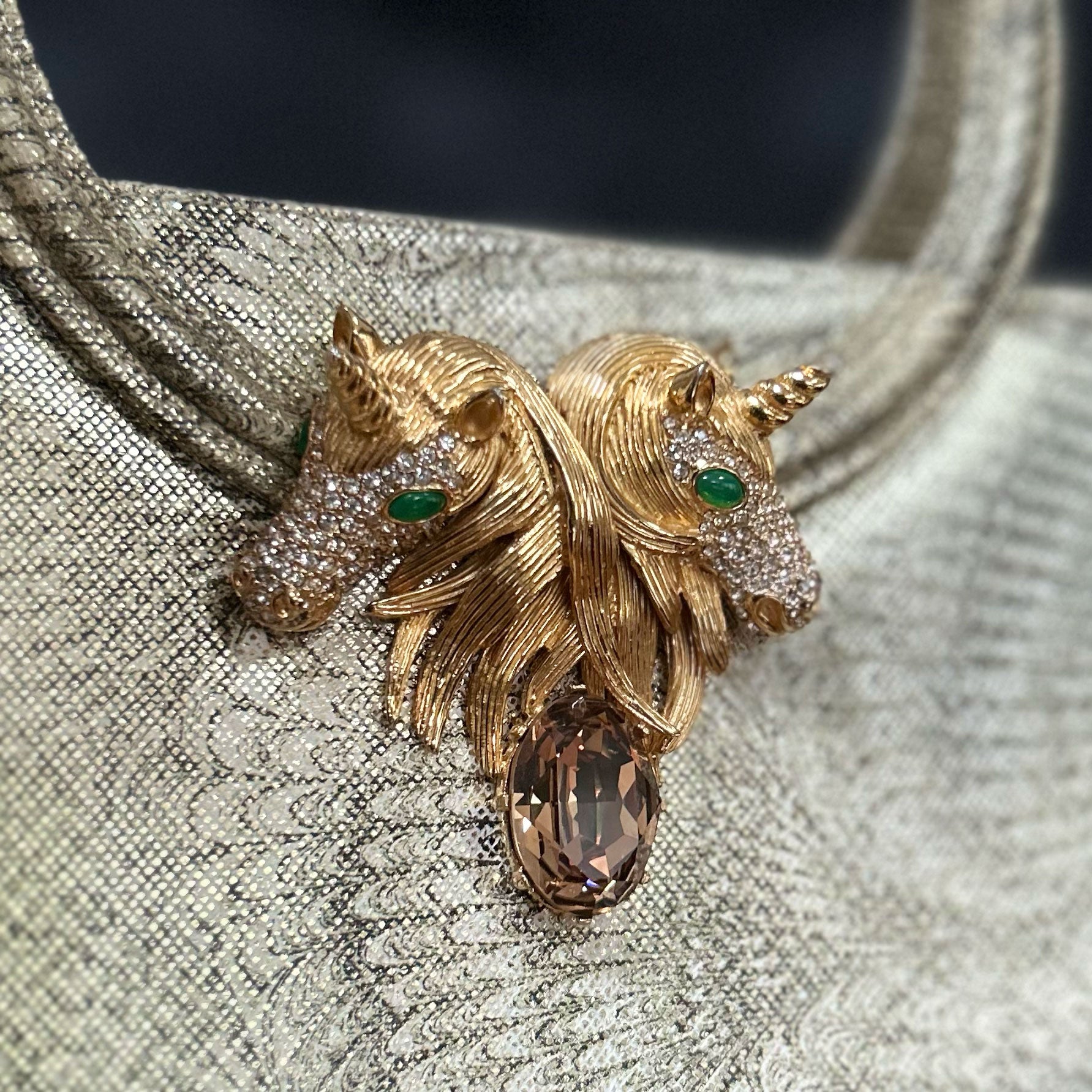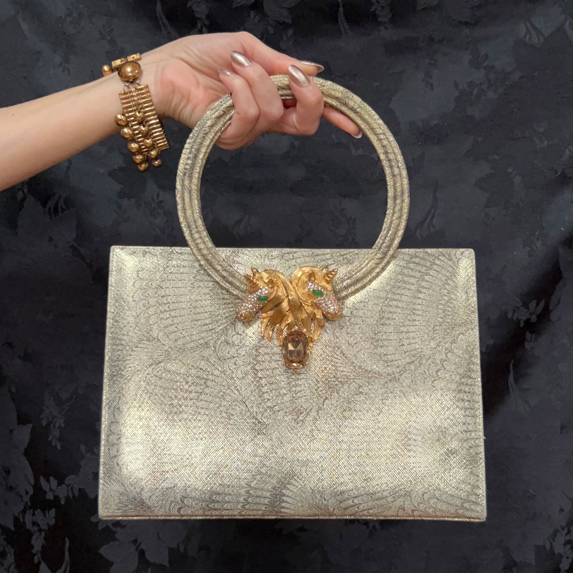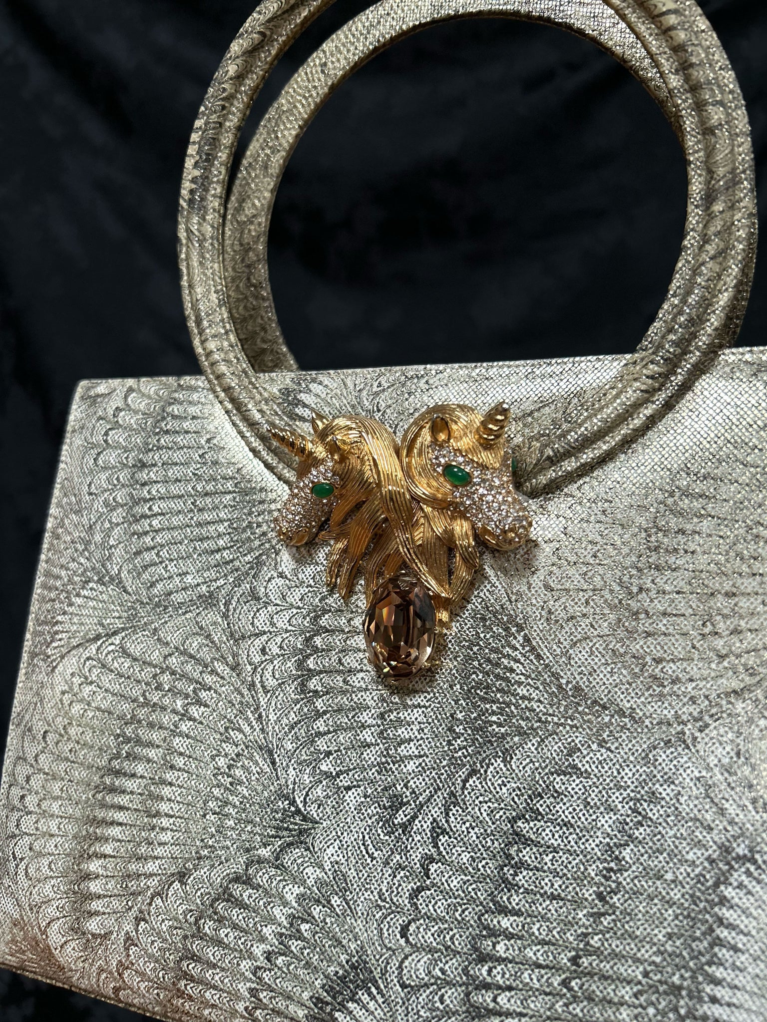 The literal unicorn of vintage handbags: a rare one-of-a-kind bag by an elusive designer. The delightful shape of this midcentury beauty is enhanced by metallic shimmer in a feathery pattern. We love this one for its whimsical glamour combined with super functionality. Tons of fun pockets and twin jeweled unicorns...truly magical.