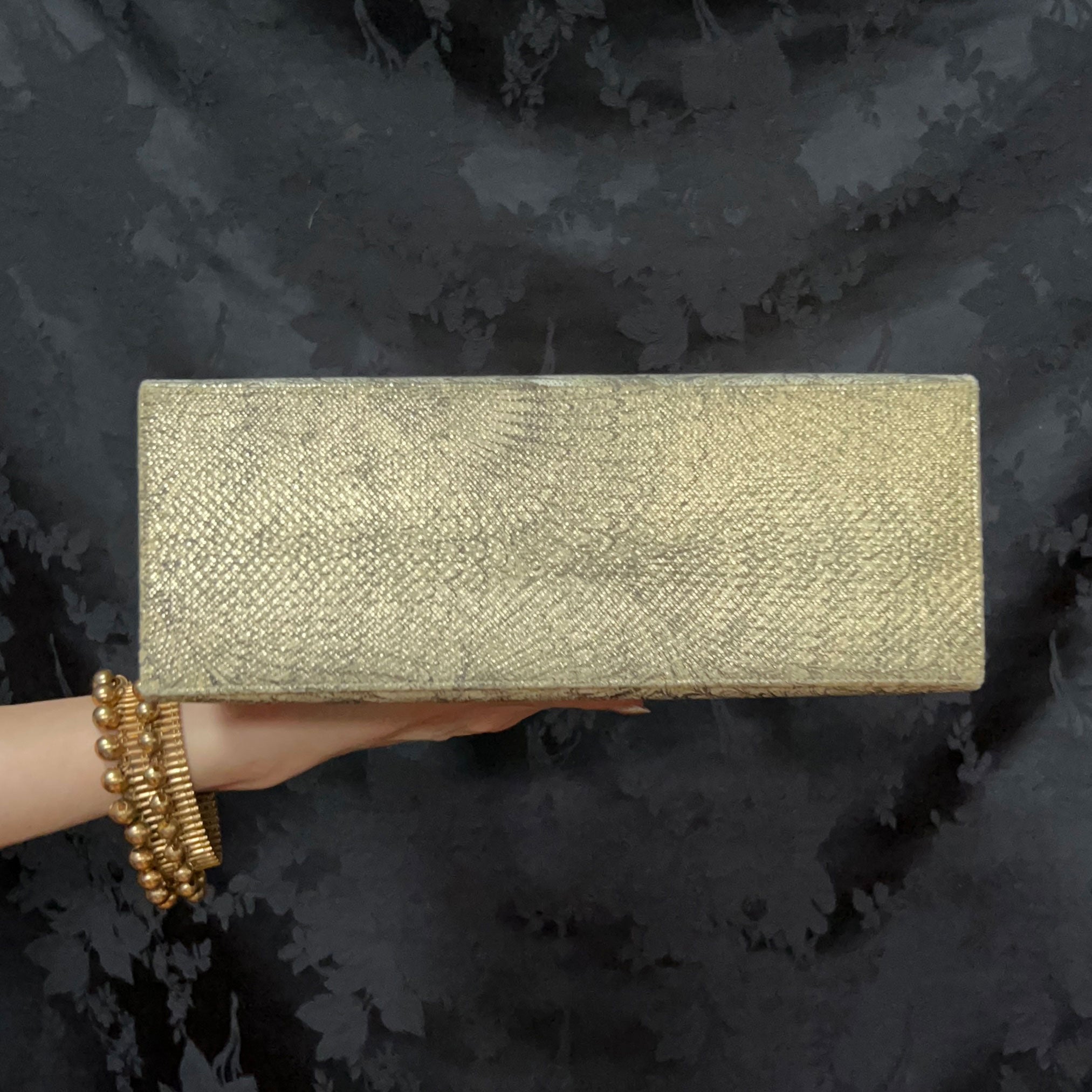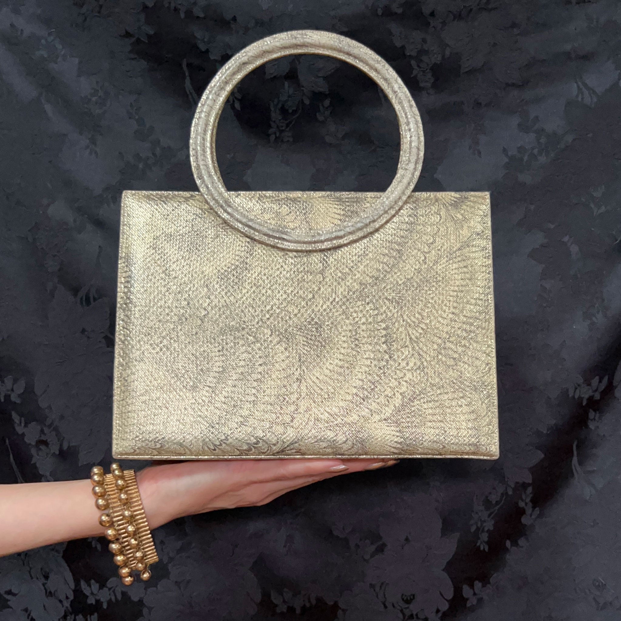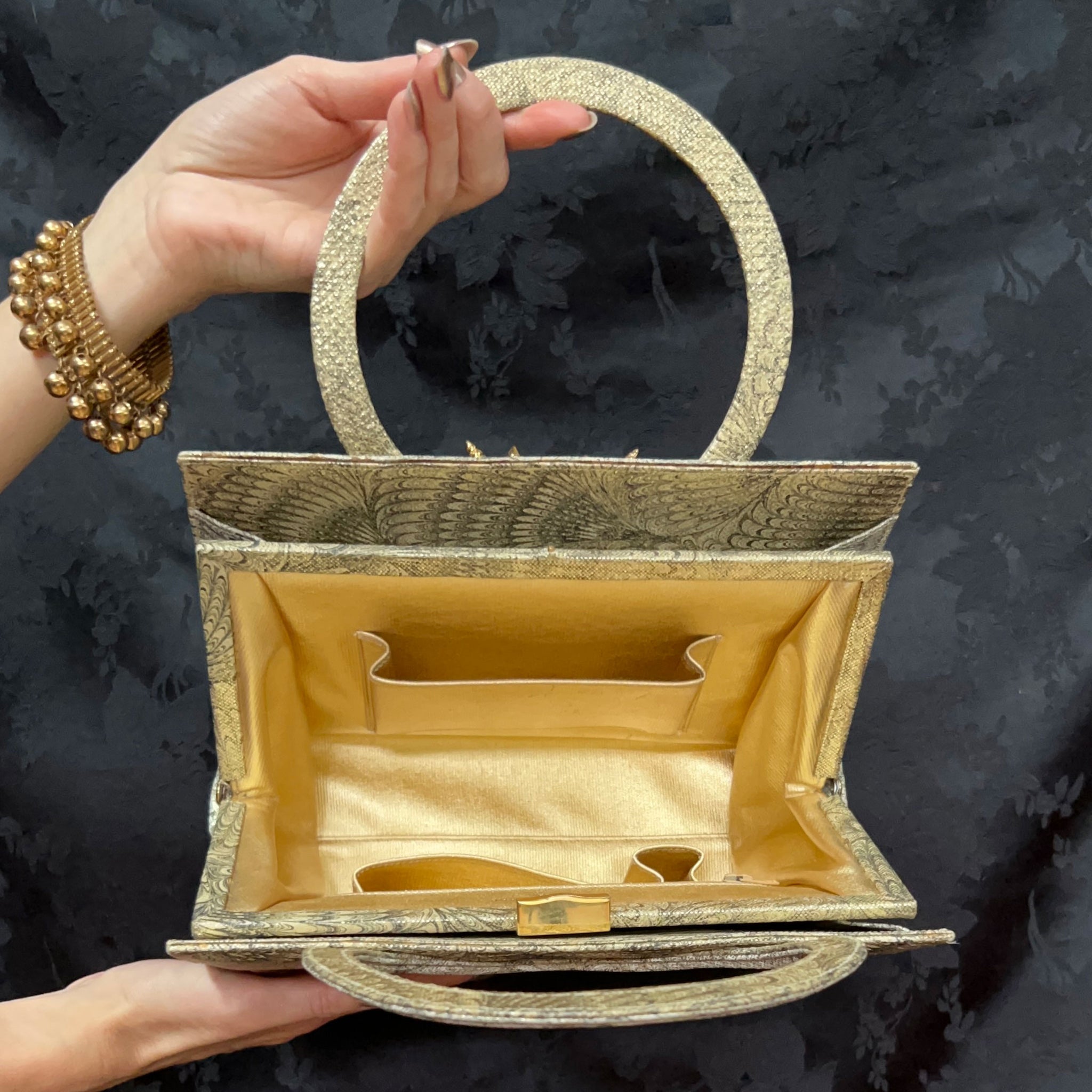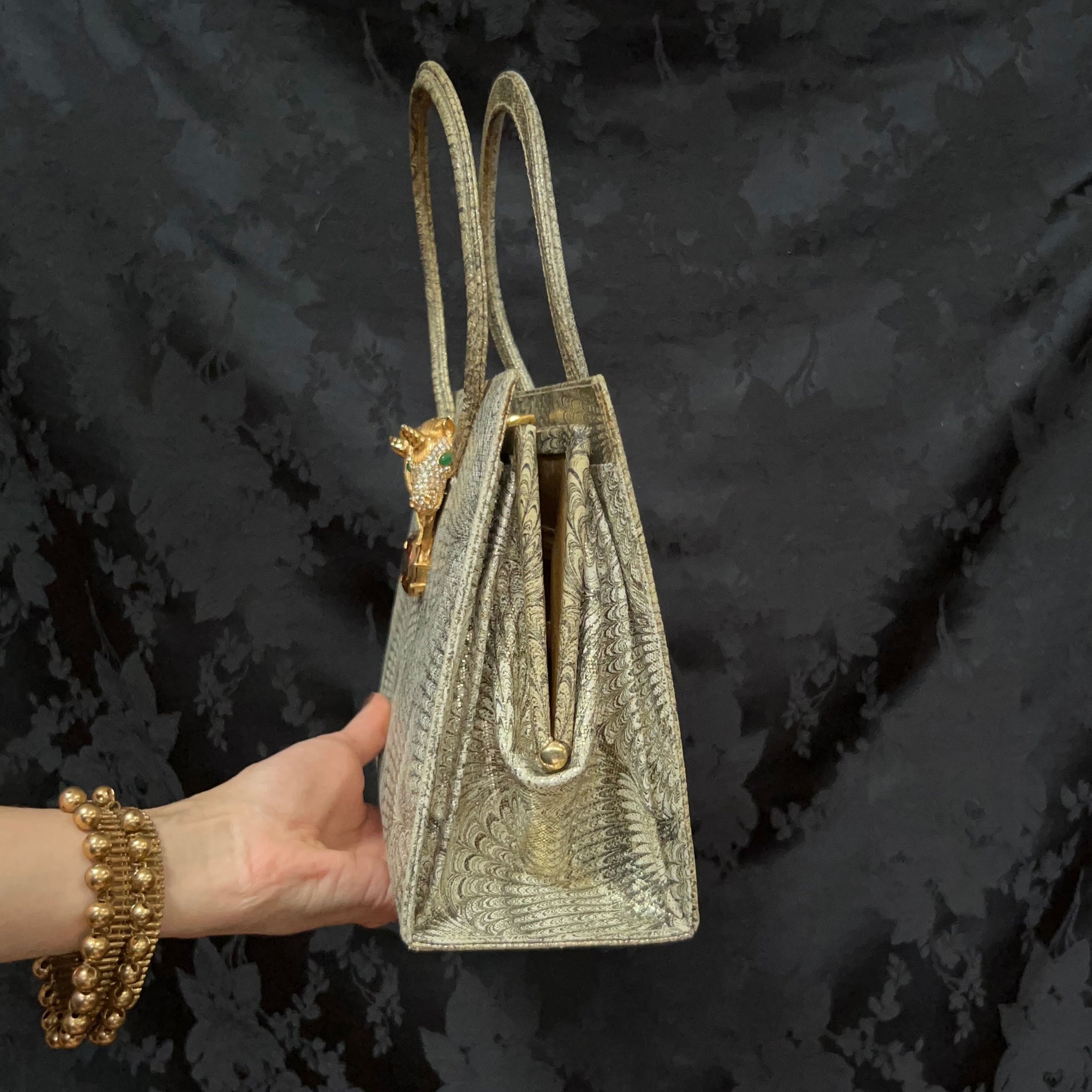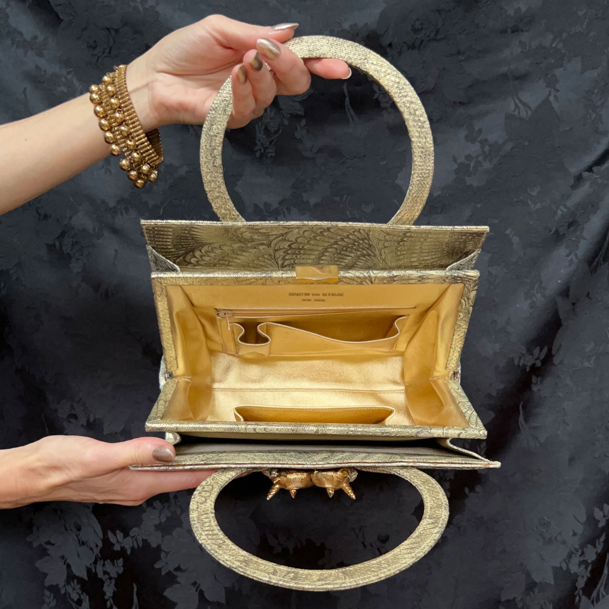 Crafted of textured and printed leather, gold plated metal, and crystals. Bag measures 11.5" tall from base to top of handle, 9.5" wide and 3.5" deep at base on the exterior. The bright gold interior is about 5.5" tall, 8.5" wide and 3" deep at base. Features exterior pockets on each side of the main compartment that snaps closed. Inside are loads of mini pockets: a zipper pocket, two slip pouches, and one for lipstick. Bag is in gorgeous condition with some age seen in the coloration of the leather, mostly visible on the handle and back side.