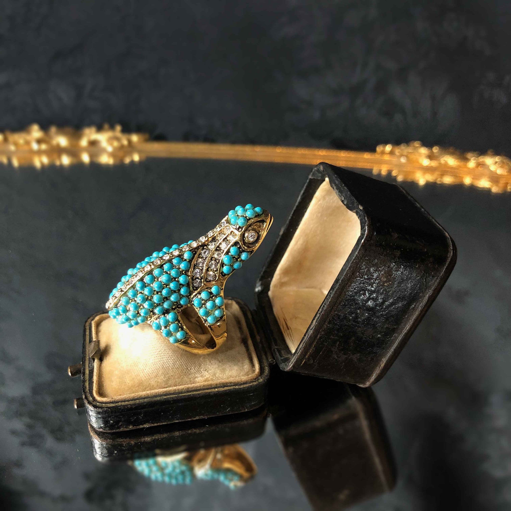 Faux turquoise beads dot the sides of this tiny blue salamander. The elegant, slinky curve of the body and tail is accented with gold streaks and clear crystals. A chic wildlife statement ring that helps you start a conversation about endangered species and wetlands protection.