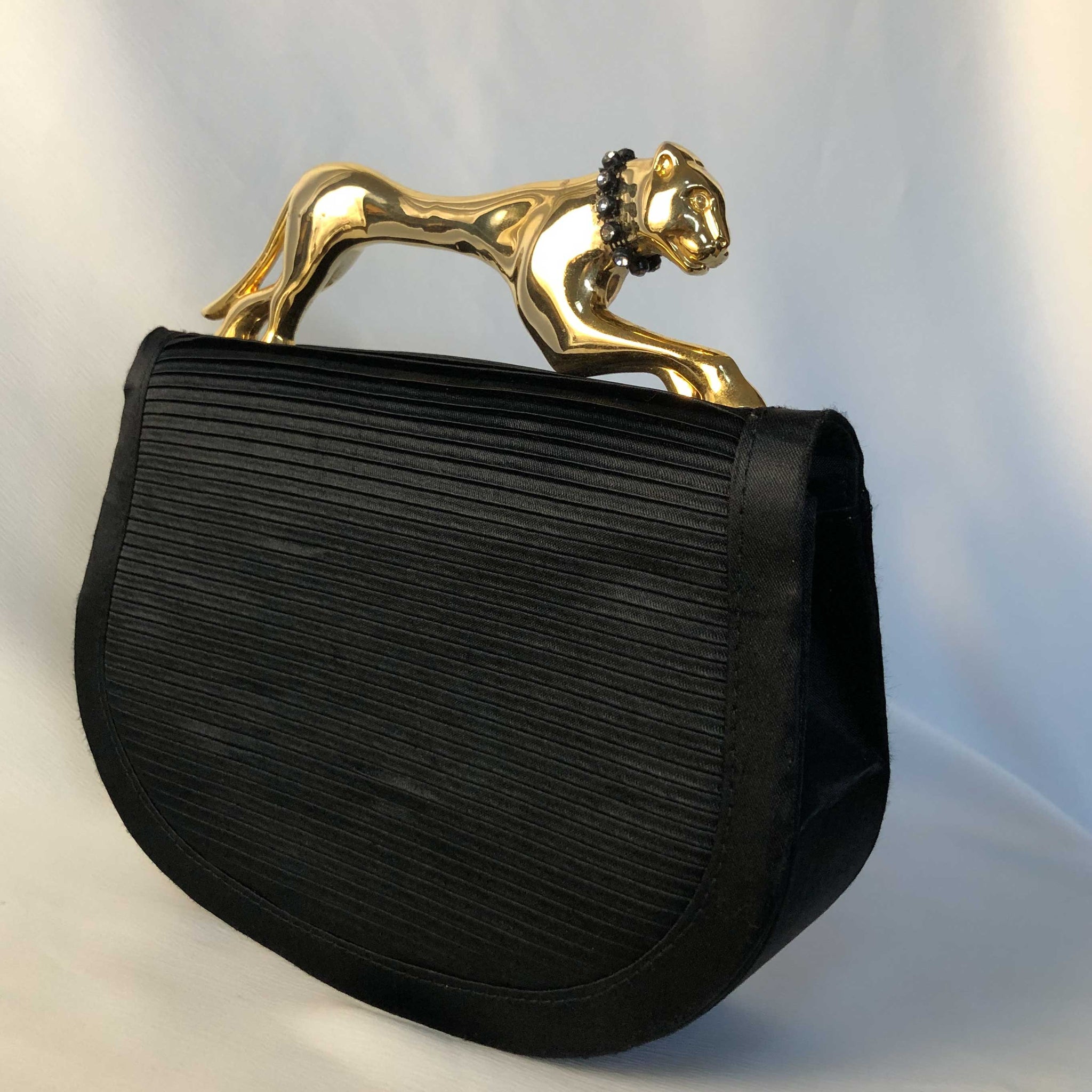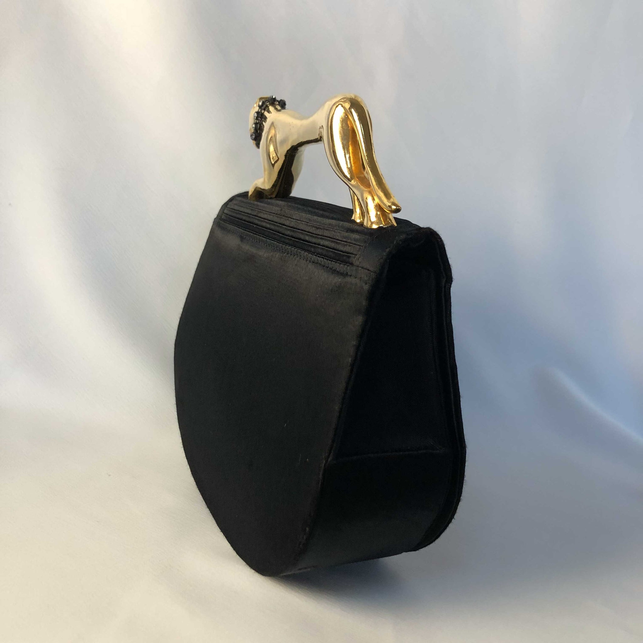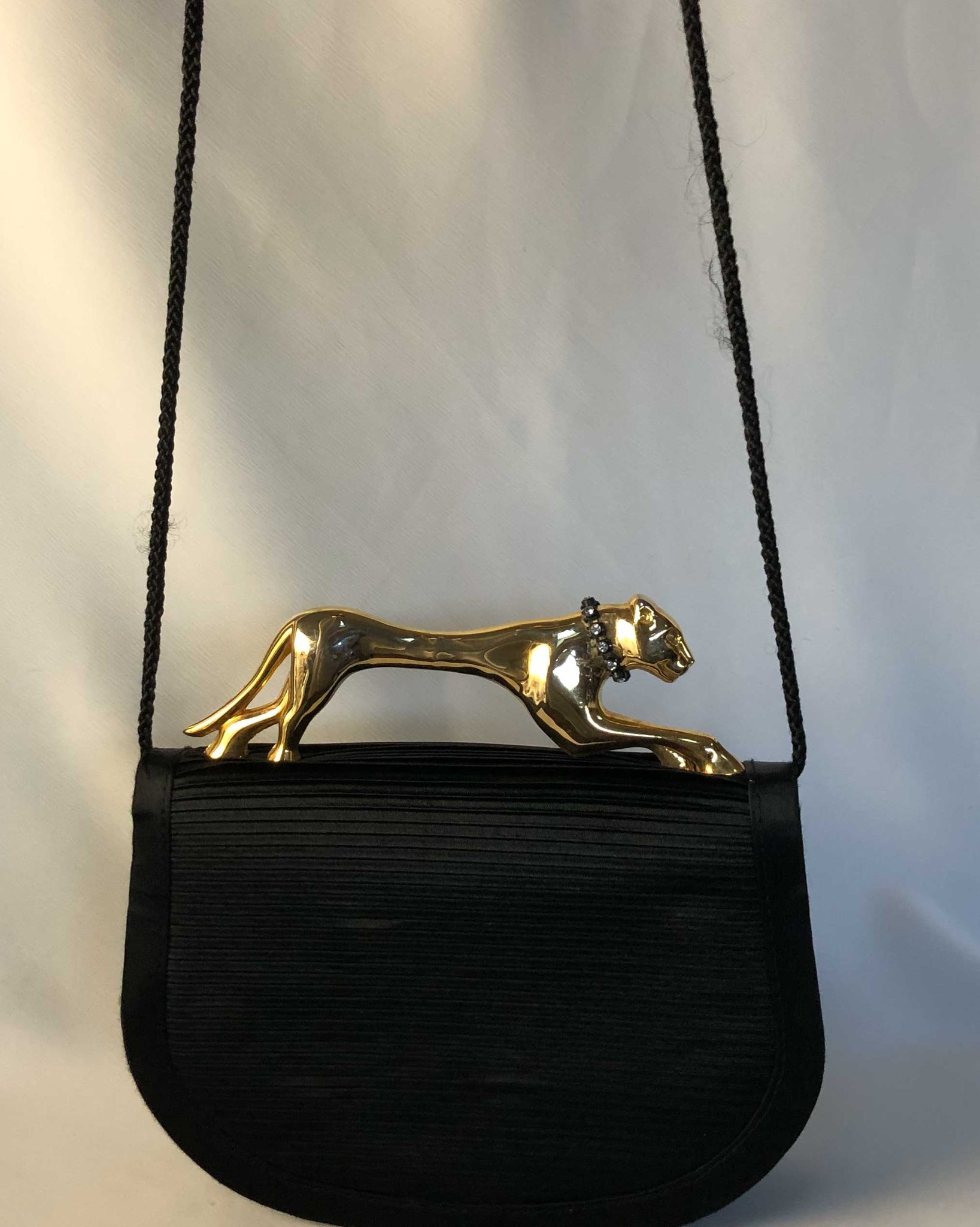 Vintage black satin, cord strap, and gold plated metal cat with plastic and crystal collar. Bag body measures 8" at widest point, 5.5" tall. Strap has a 20" drop to the top of the handle.