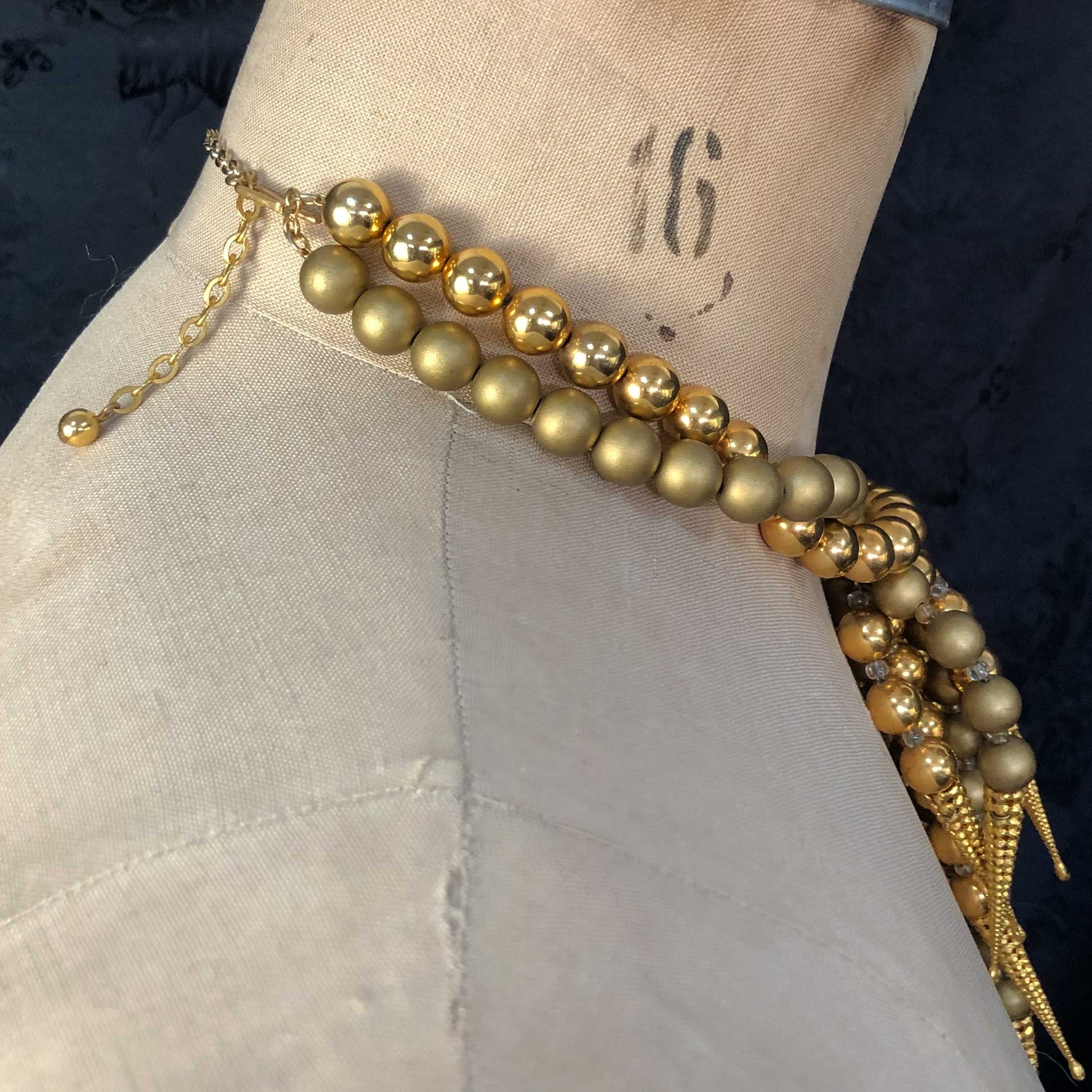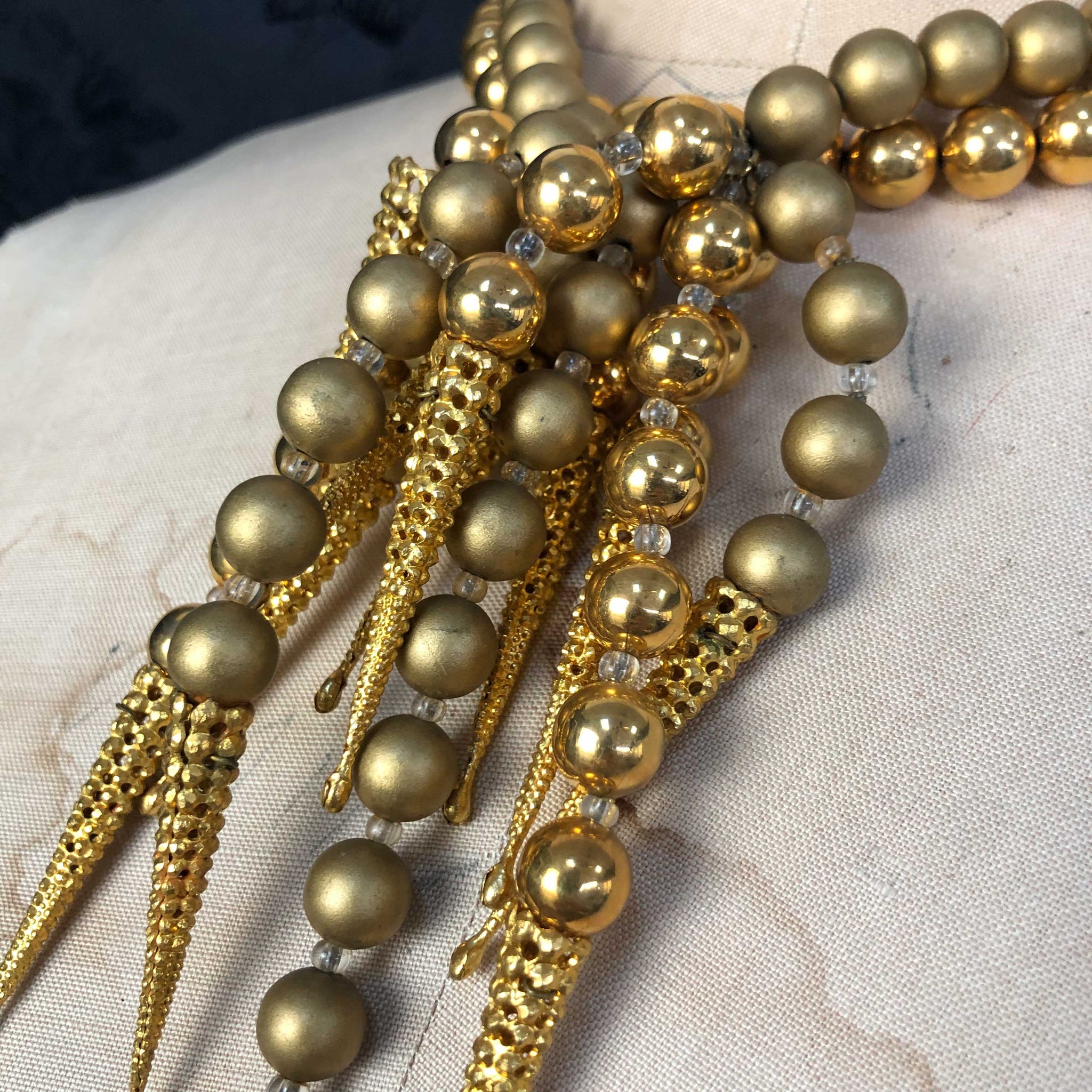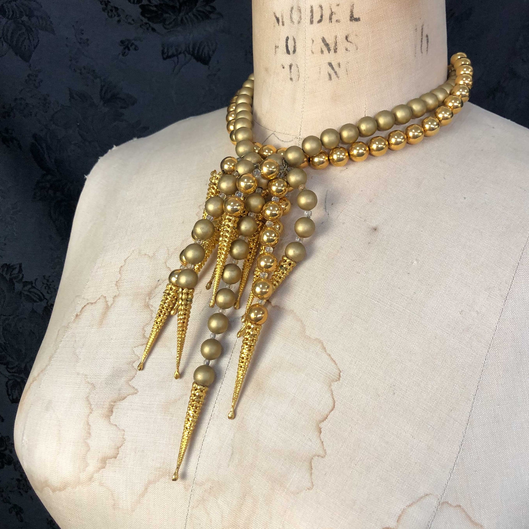 Bright gold and matte beads twirl together with filigree spikes like an exploding cluster of celosia blooms. Tiny clear beads add sparkle to this spiky burst of glamour. Twist the chains to give it more volume. A superb French beauty from a high-end estate. Shown with our Goddess Belt.