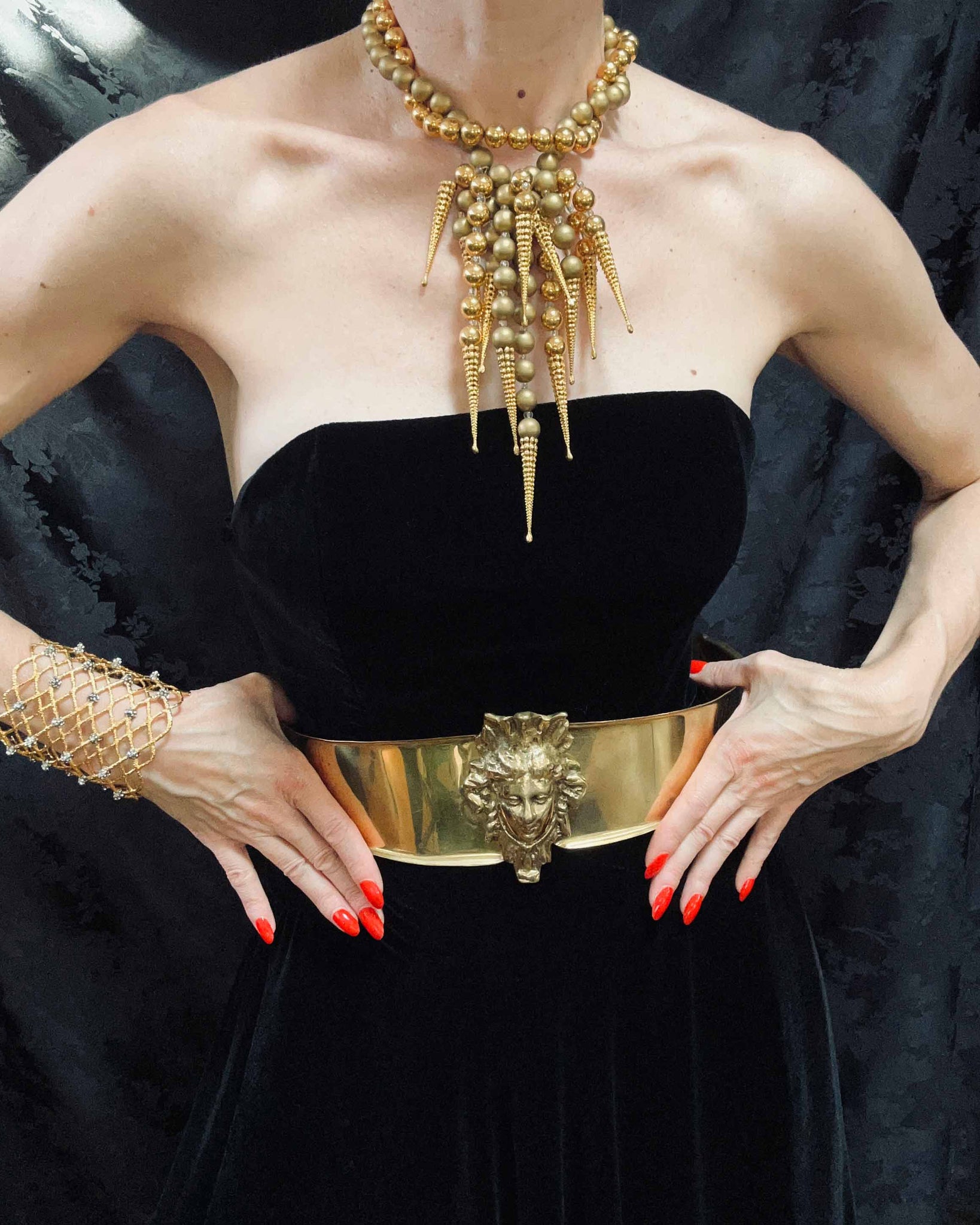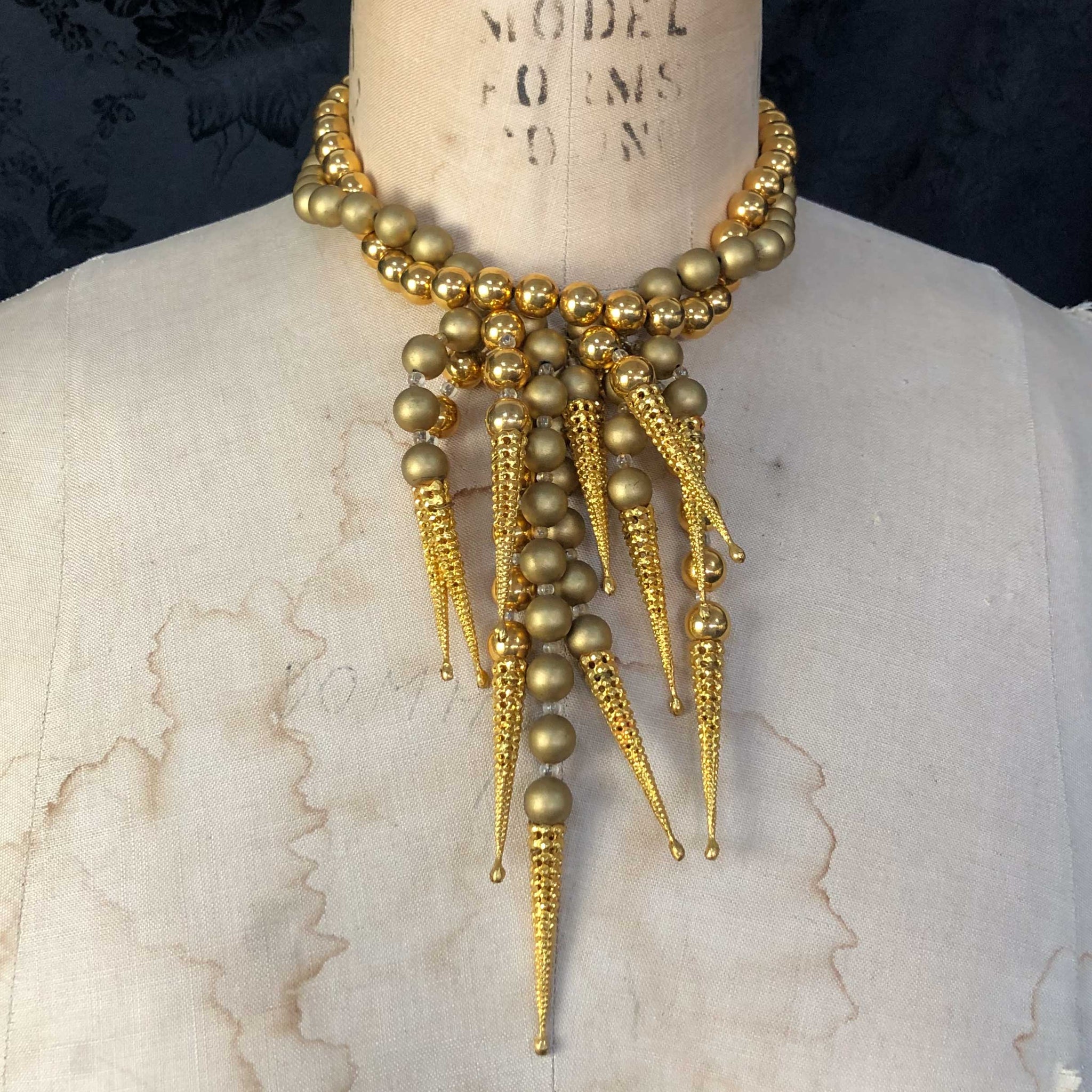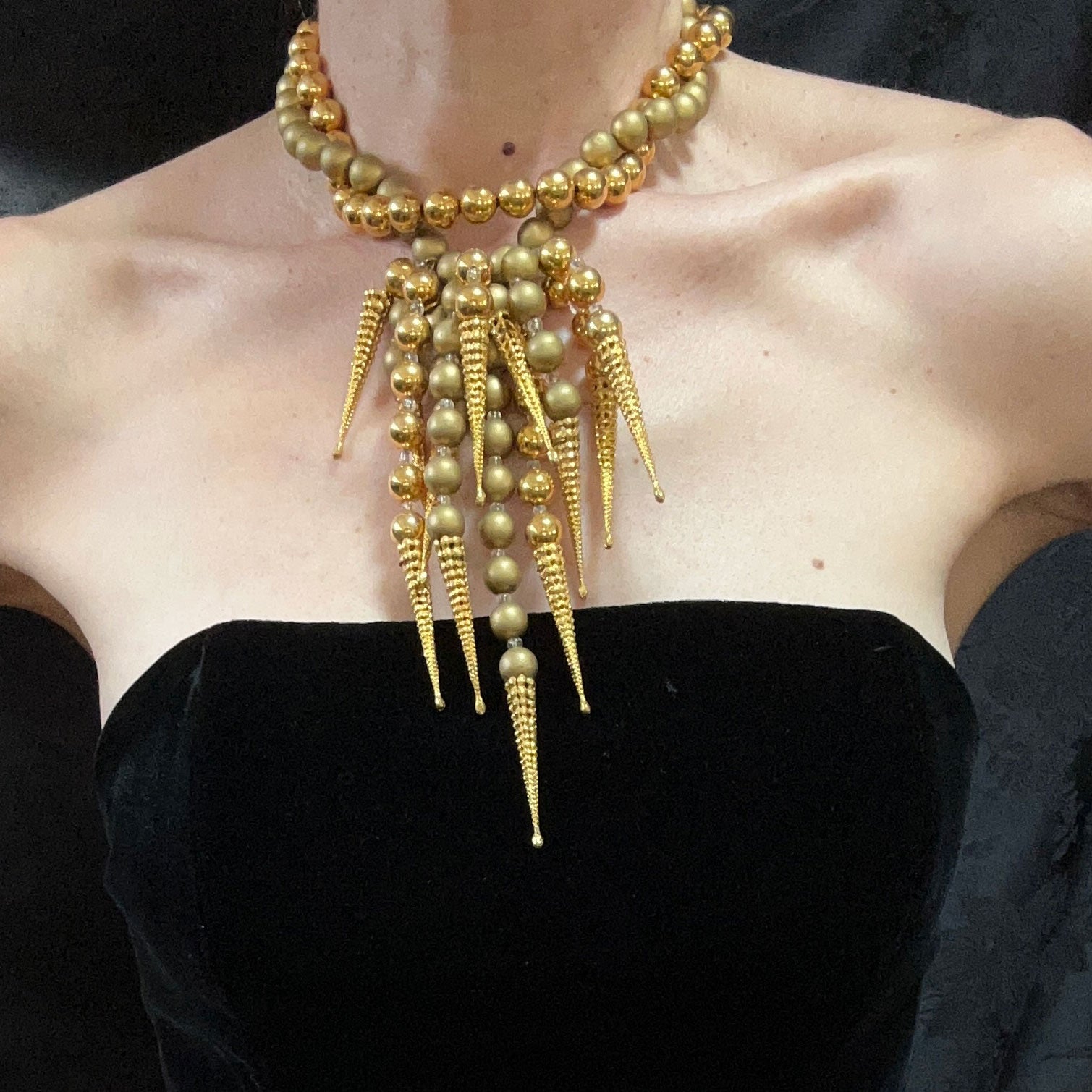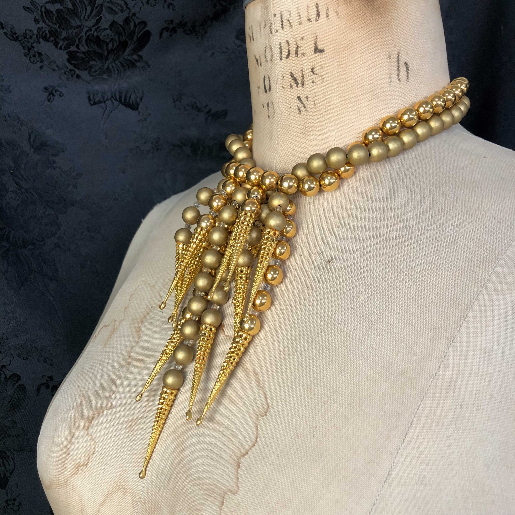 Bright gold and matte beads twirl together with filigree spikes like an exploding cluster of celosia blooms. Tiny clear beads add sparkle to this spiky burst of glamour. Twist the chains to give it more volume. A superb French beauty from a high-end estate. Shown with our Goddess Belt.