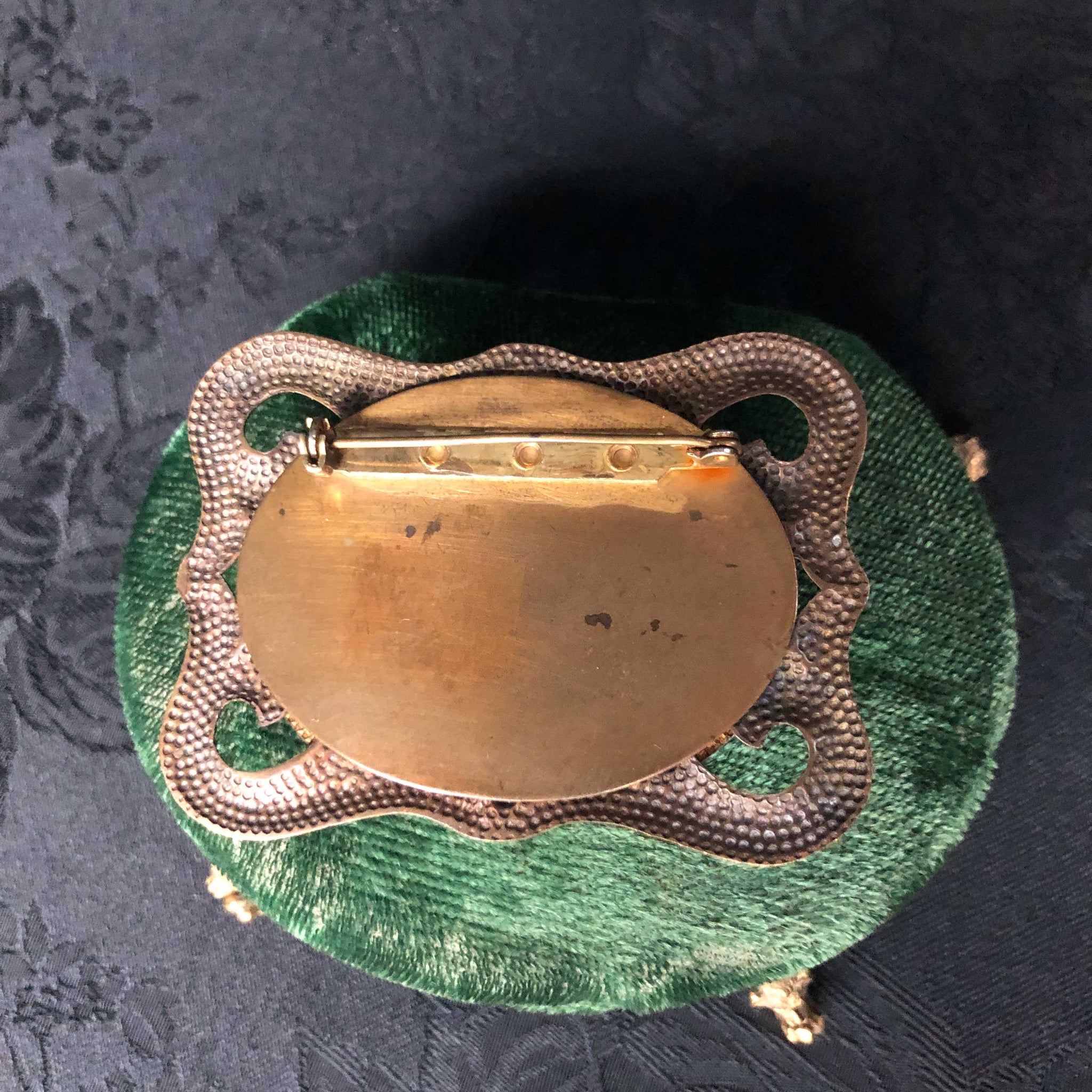 Measures 2.5 x 1.75 inches. On pin with safety clasp.