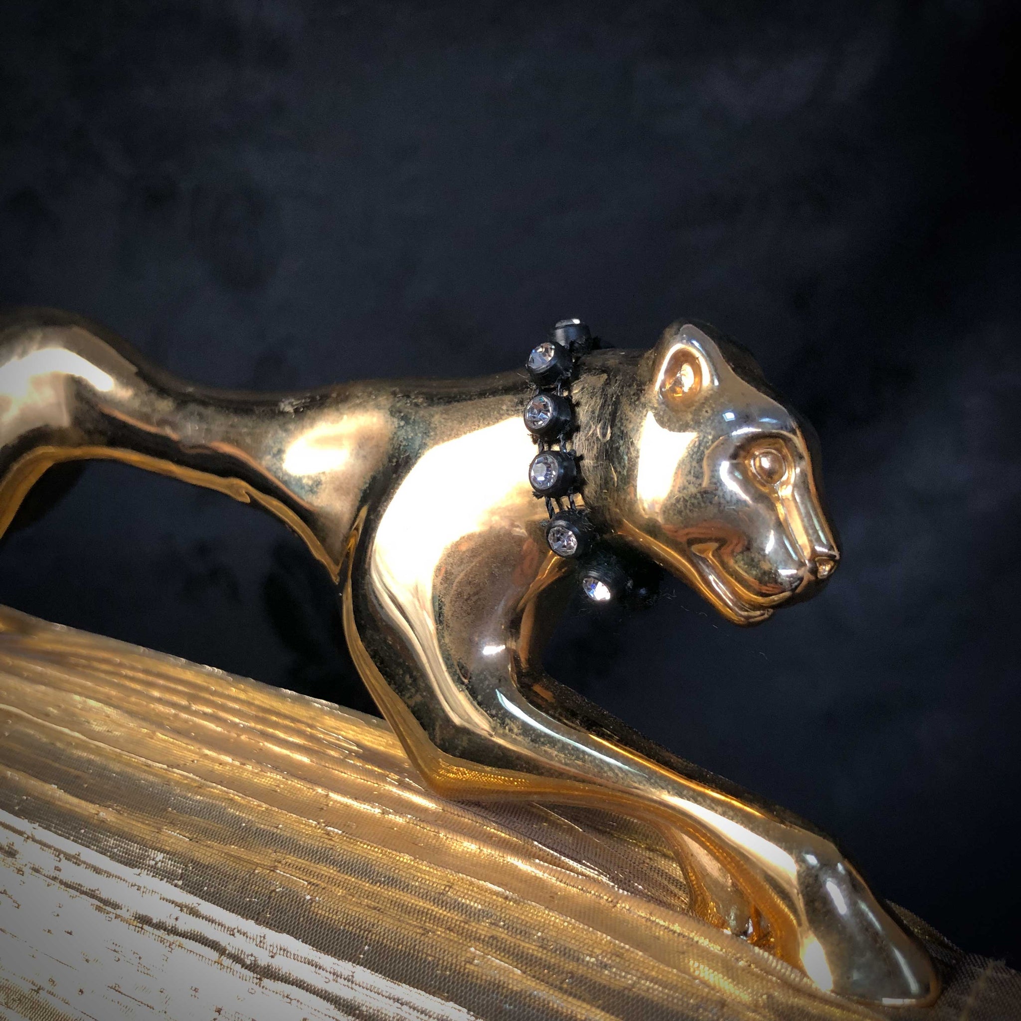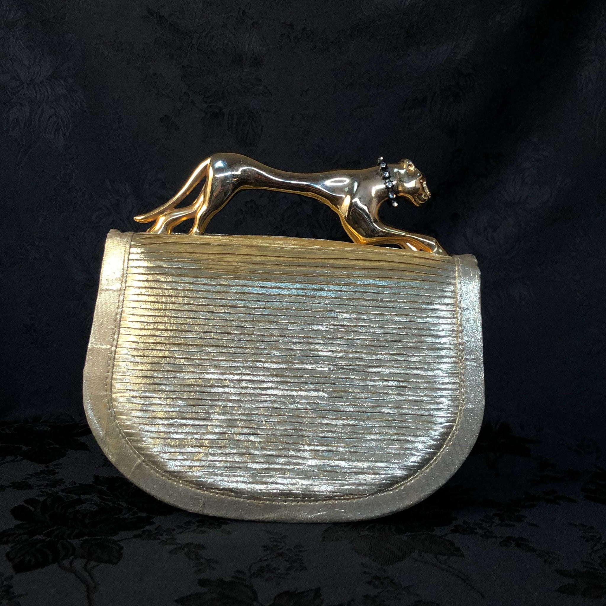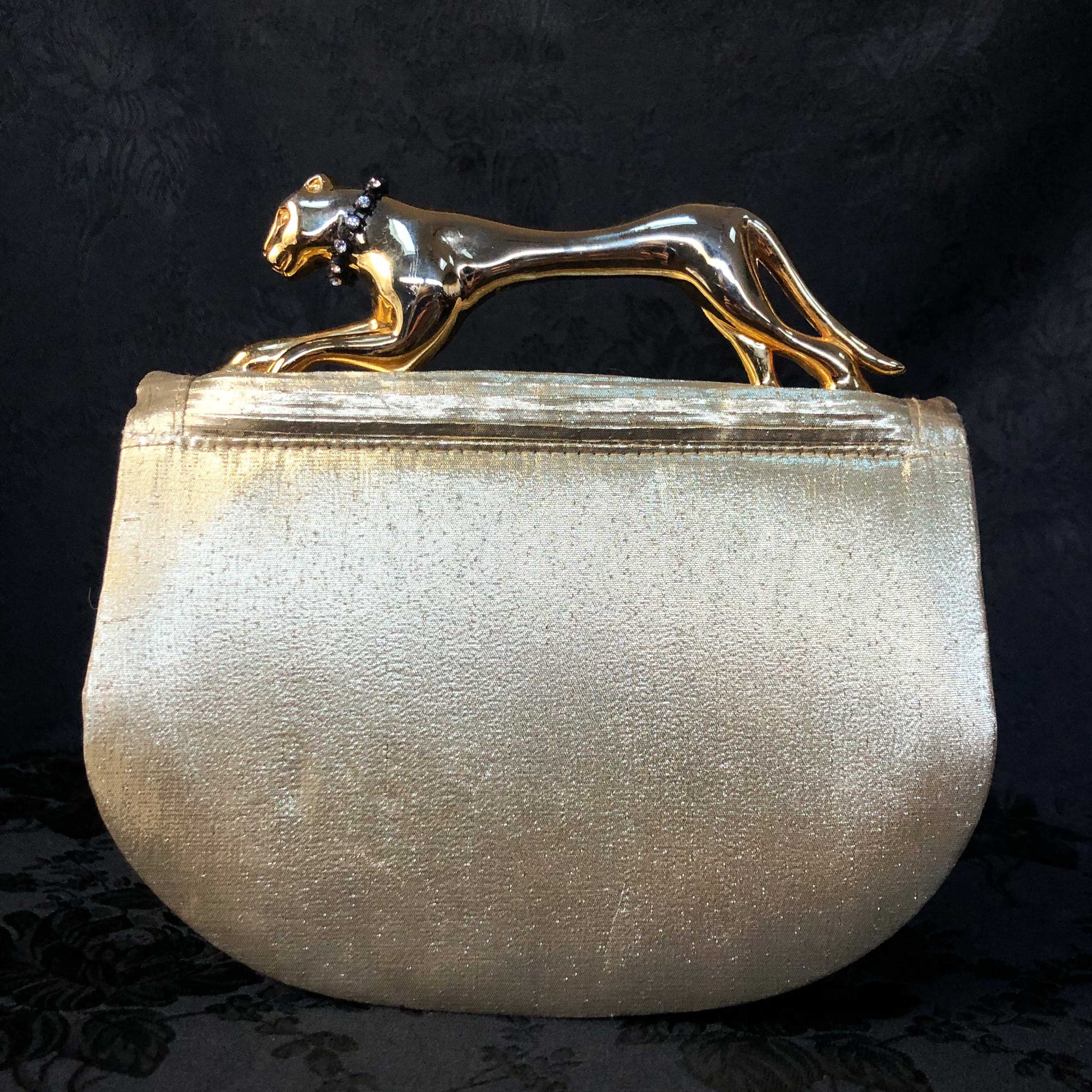 Cats were enthusiastically idolized in Ancient Egypt, with an array of feline goddesses representing strength, justice, fertility and motherhood. The cat motif commonly appeared in sculptures and bodily adornments, often gilded or bejeweled, to protect and embolden the people they surrounded. Bold is how you will feel with this stunning vintage bag. Its sleek lines and powerful feline energy have a magical quality that transcends time.