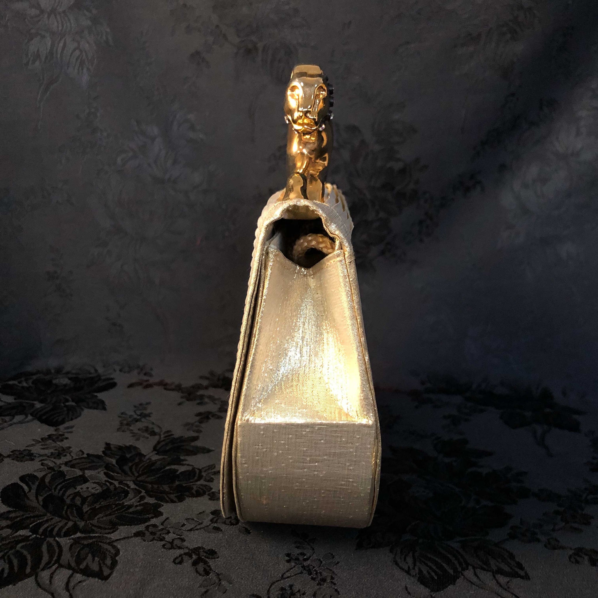 Vintage gold lame fabric, cord strap, and gold plated metal cat with plastic and crystal collar. Bag body measures 8" at widest point, 5.5" tall. Strap has a 20" drop to the top of the handle.