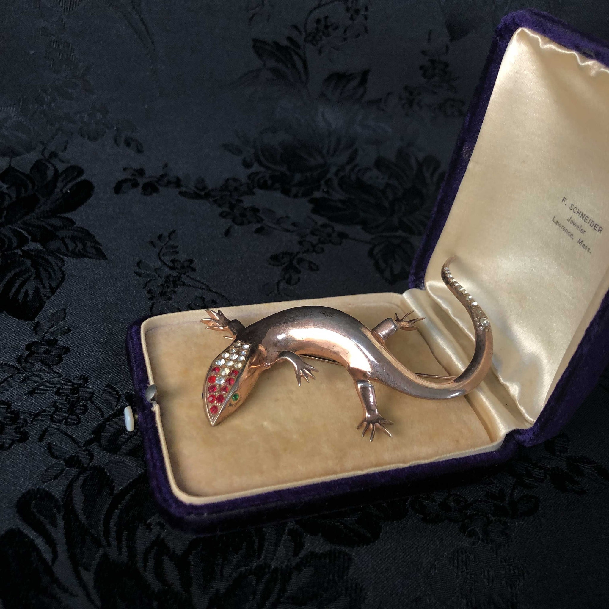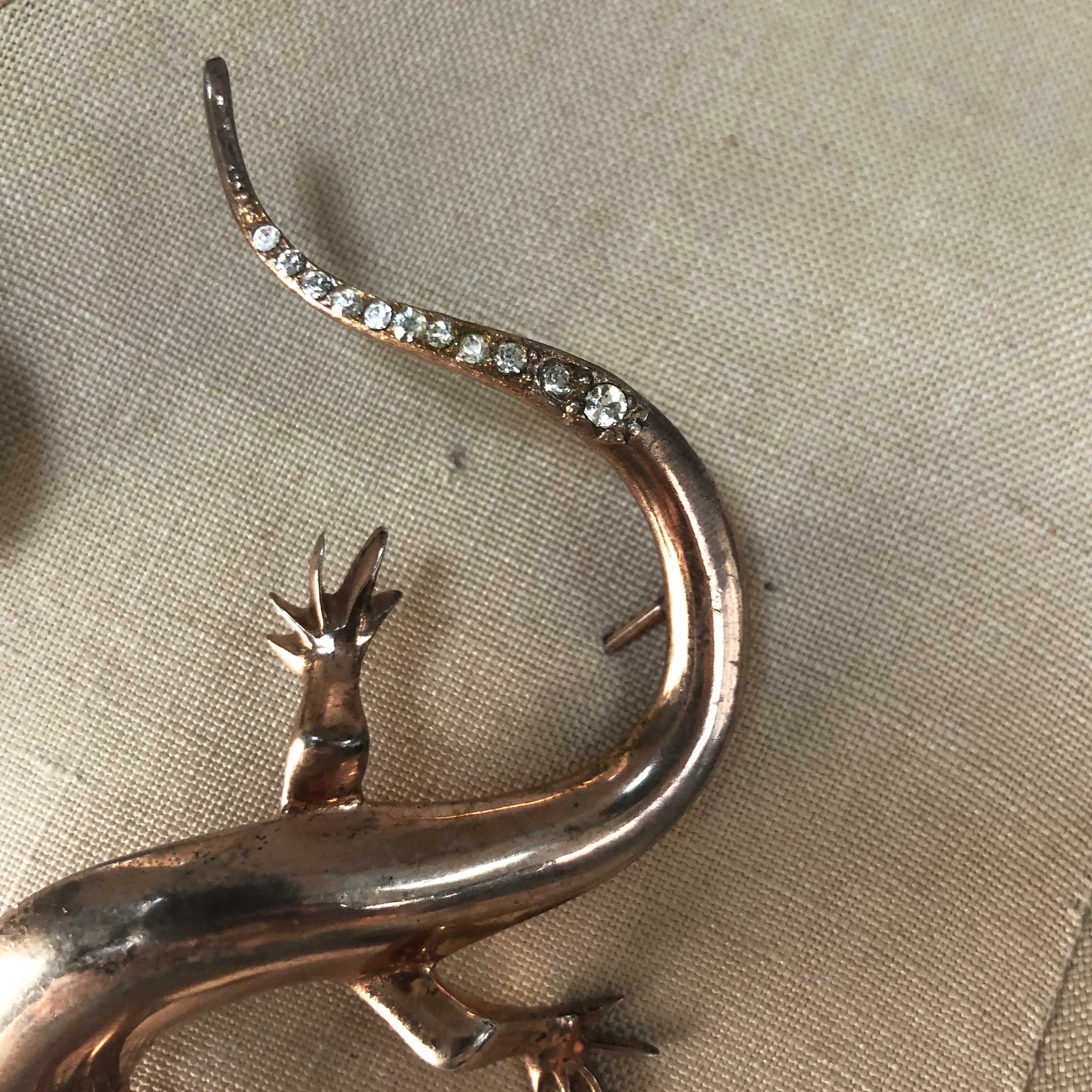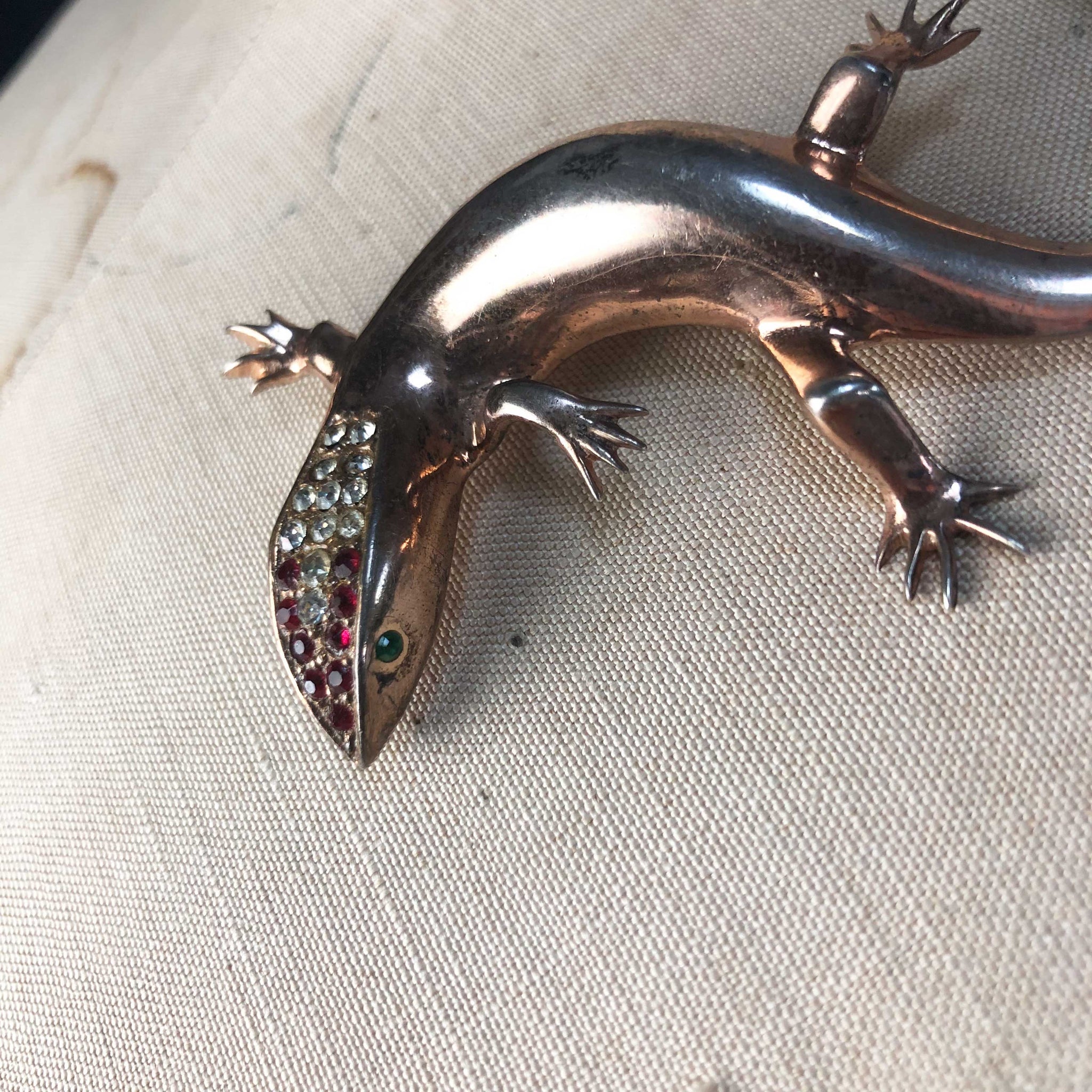 Gilt silver with crystals. Marked Sterling. Unknown maker. Measures 3.5" long. Wear to finish and mismatched eyes give this little guy loads of vintage charm.