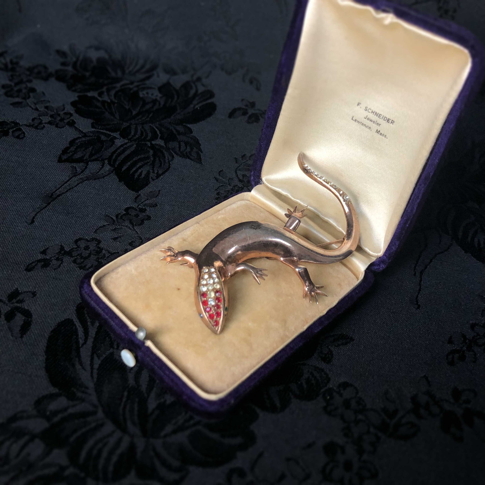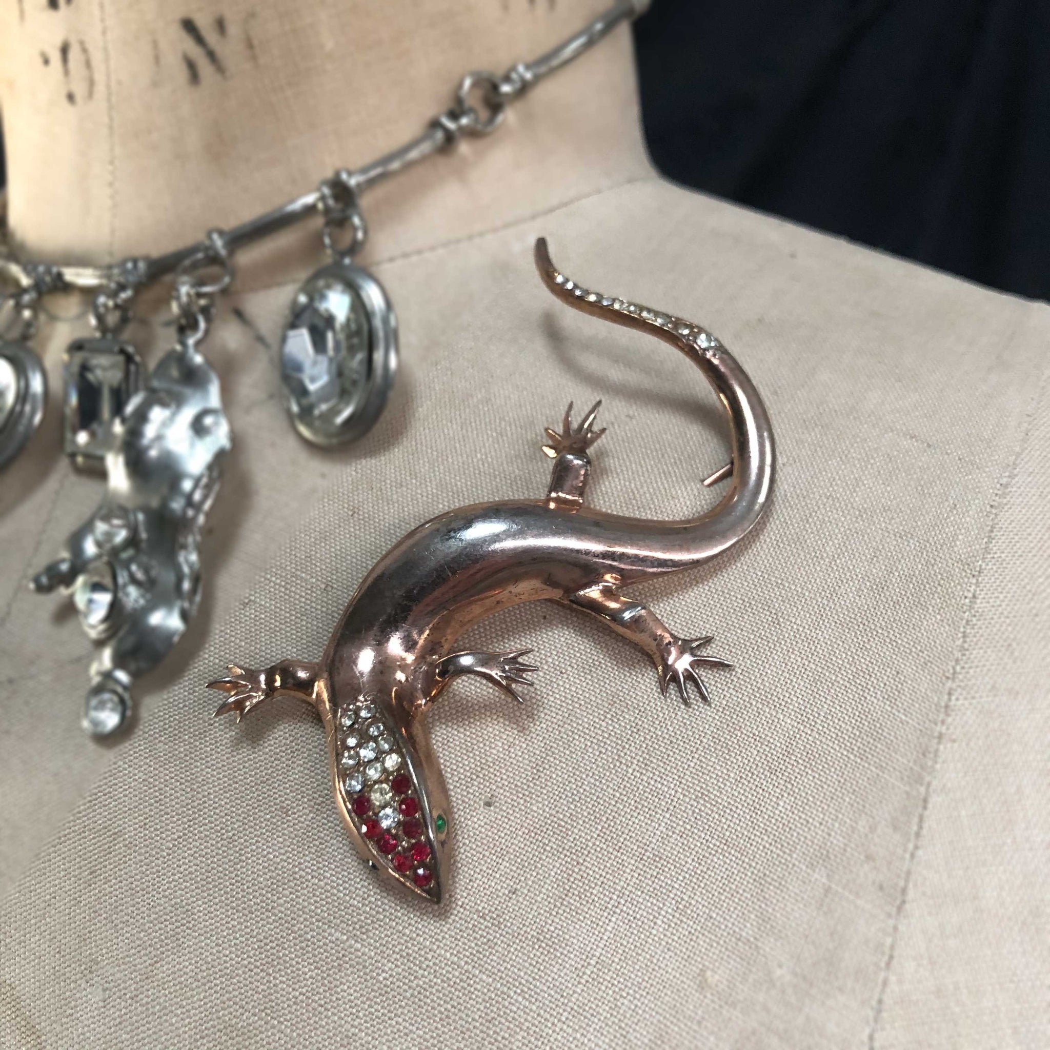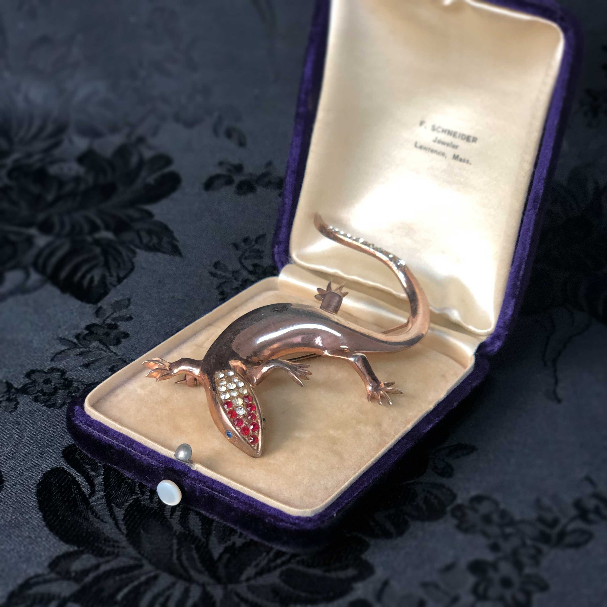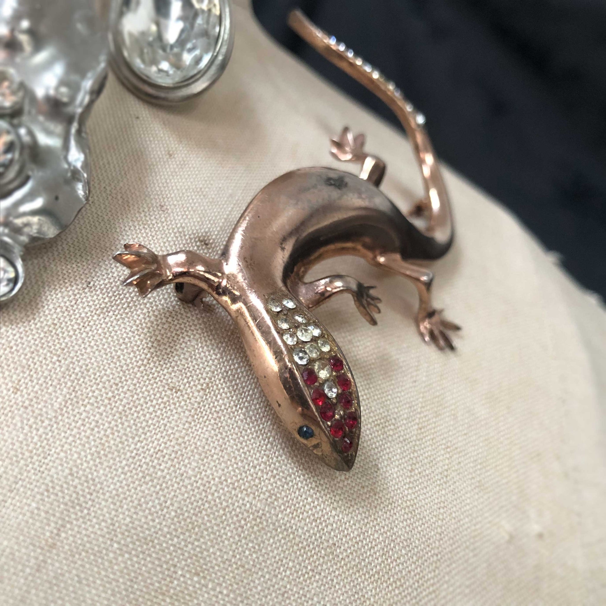 Gilt silver with crystals. Marked Sterling. Unknown maker. Measures 3.5" long. Wear to finish and mismatched eyes give this little guy loads of vintage charm.