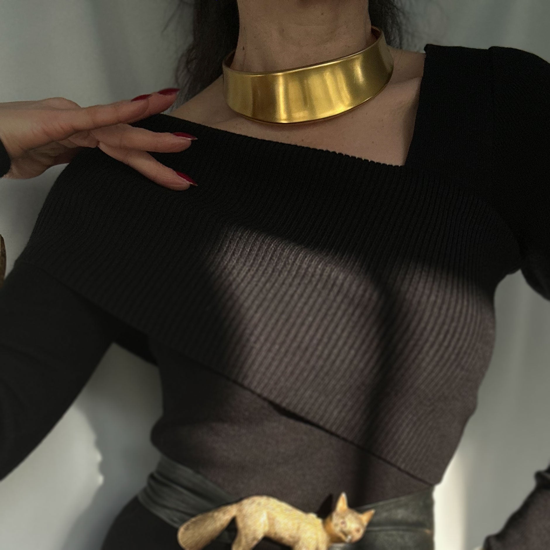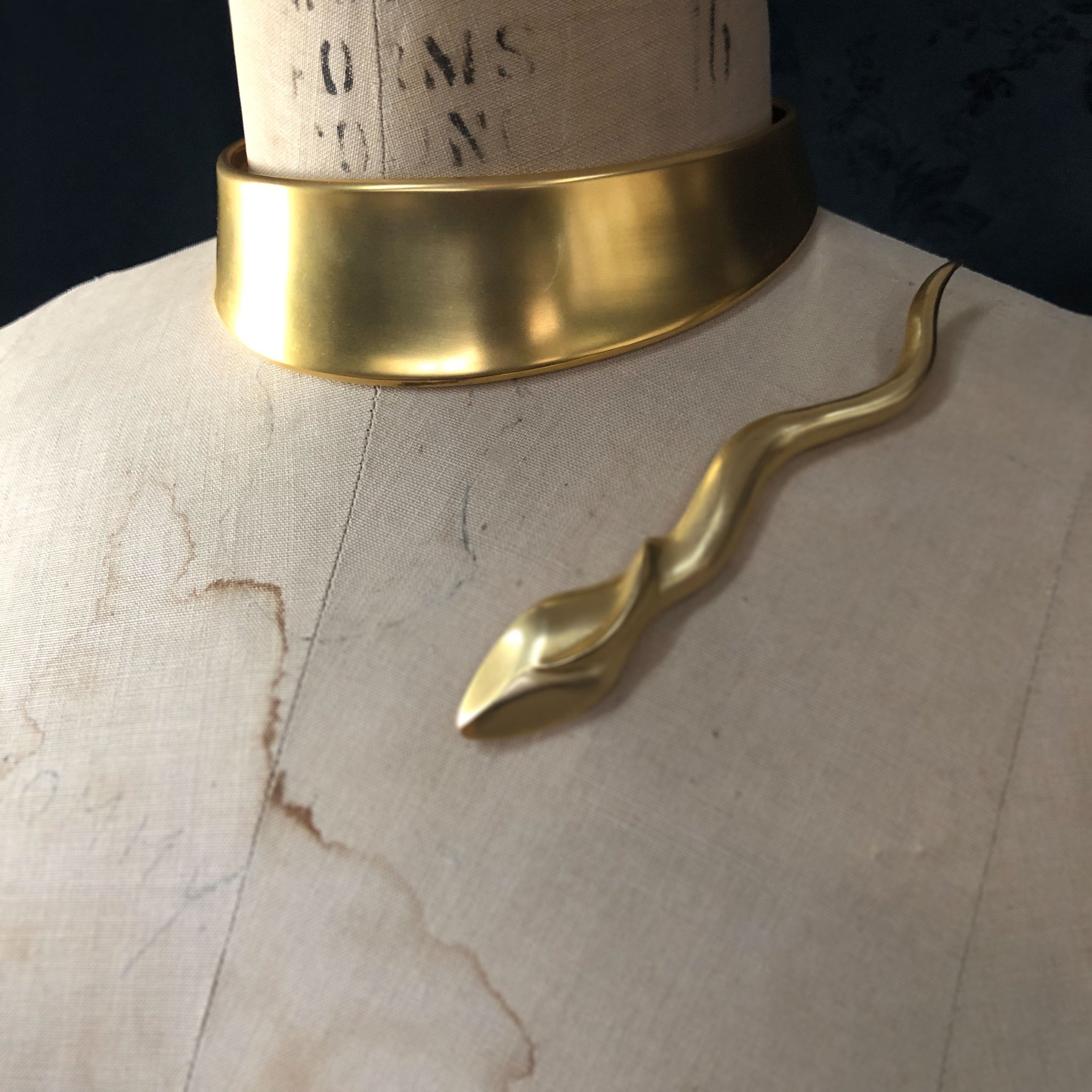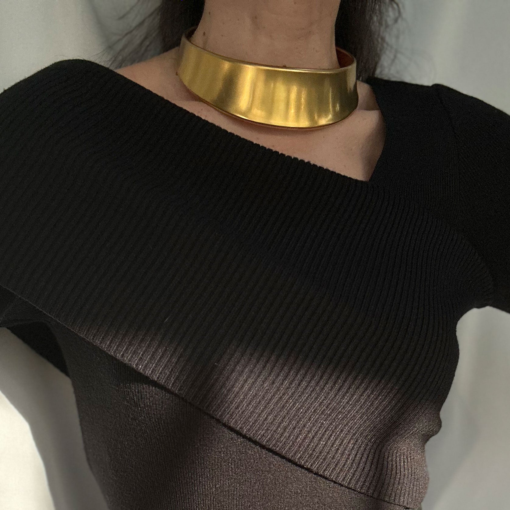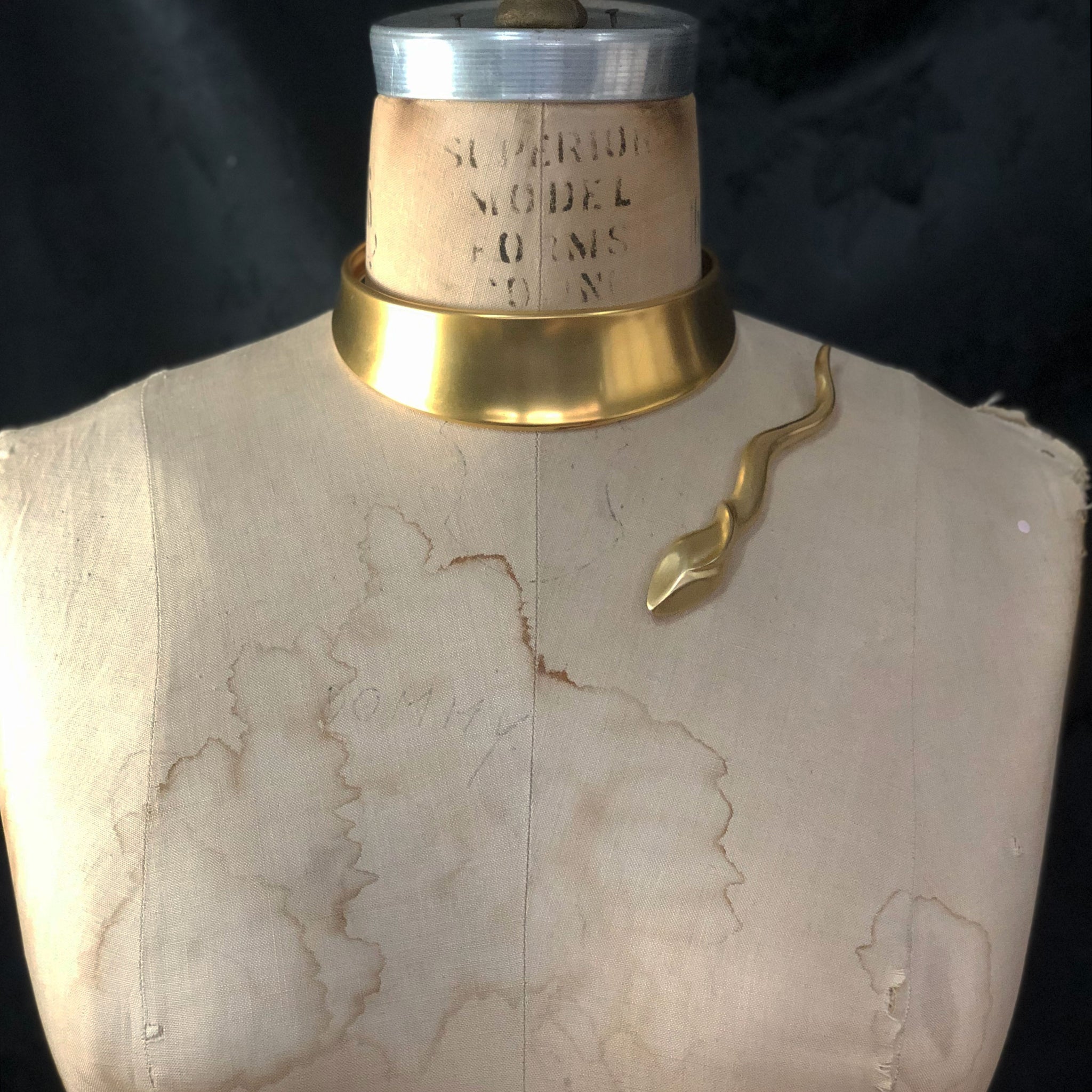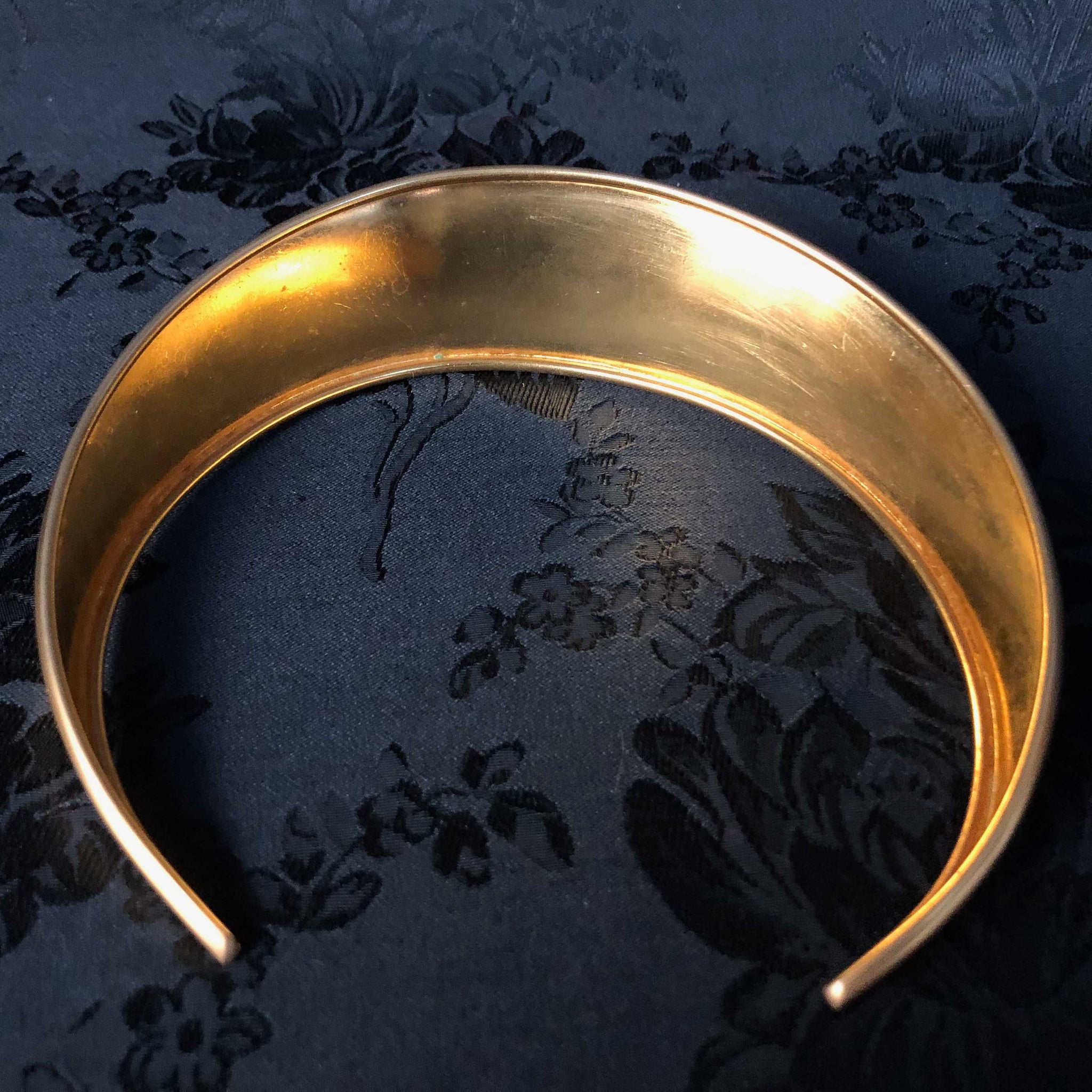 Vintage gold plated metal. Measures 1.5" wide at the front, 14" inner circumference, 2.5" at opening. Best fits a medium neck as shown on dress form, which measures xx. For size reference, the dress form measures 14-15 inches (mid-neck and collar levels); human model's neck is 12-13 inches.