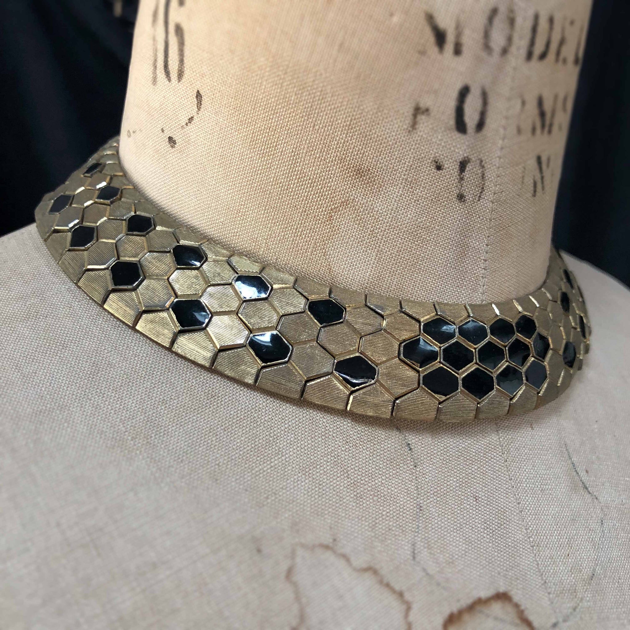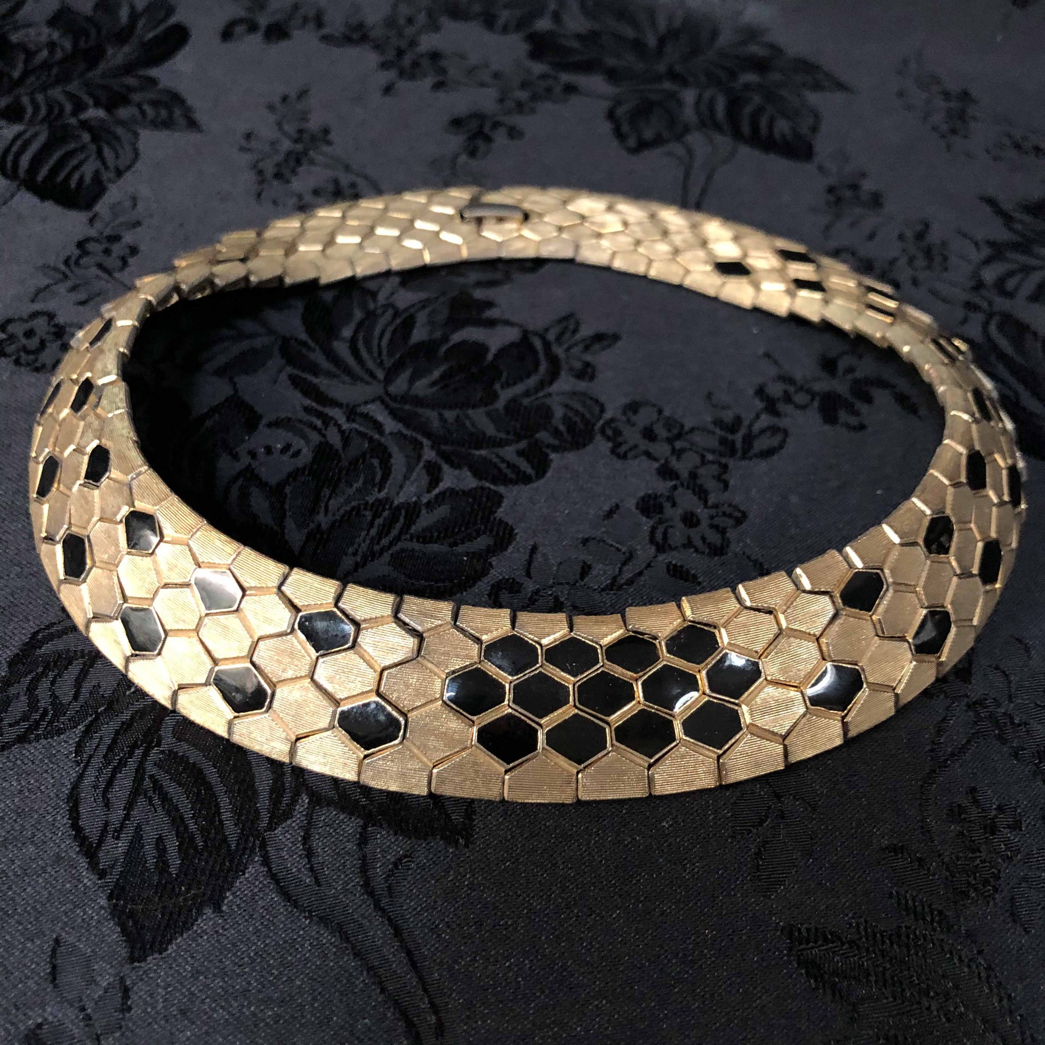 Vintage gold tone metal with black enamel accents. Measures 17" long, 1" wide. Secures with a foldover clasp. Some wear to finish on underside.