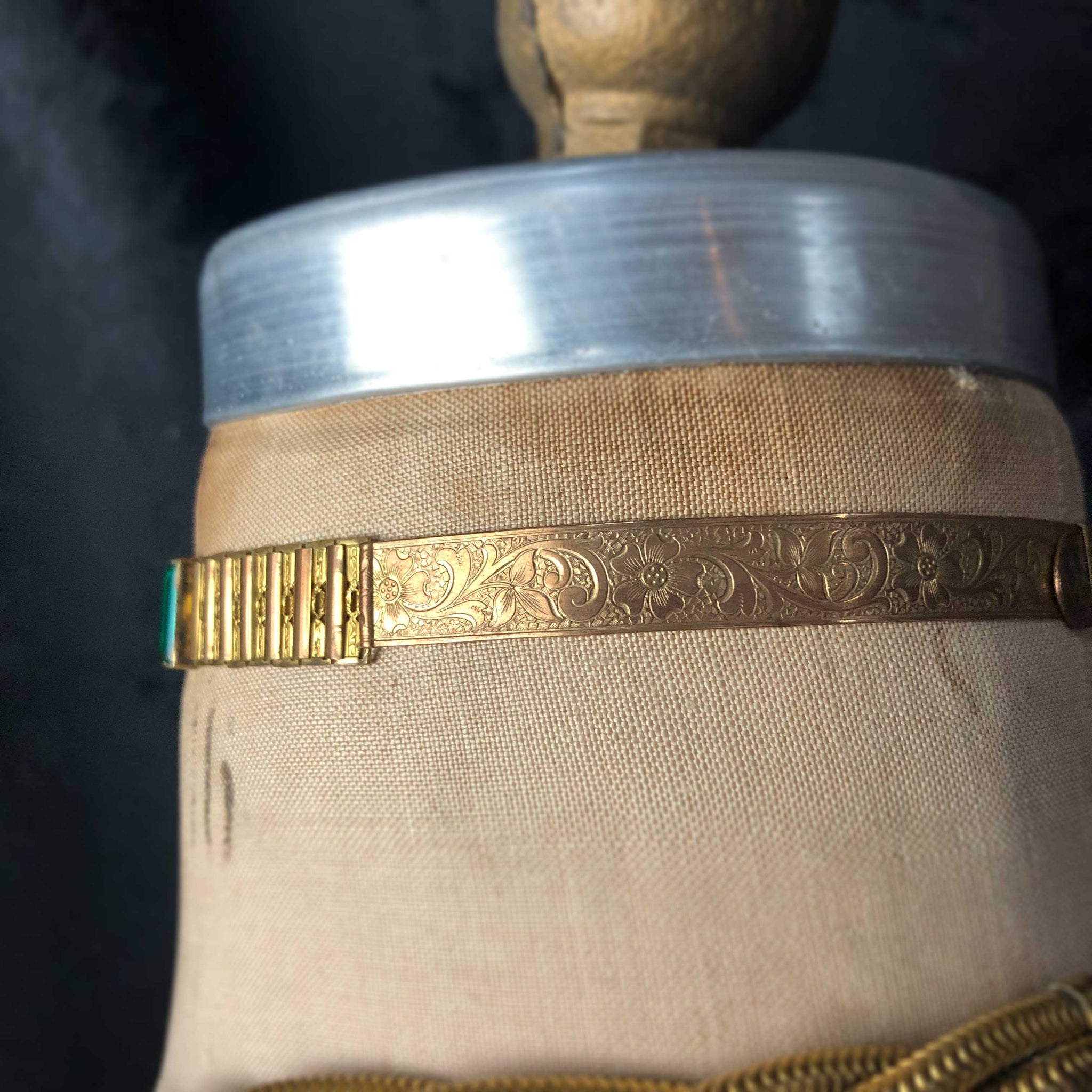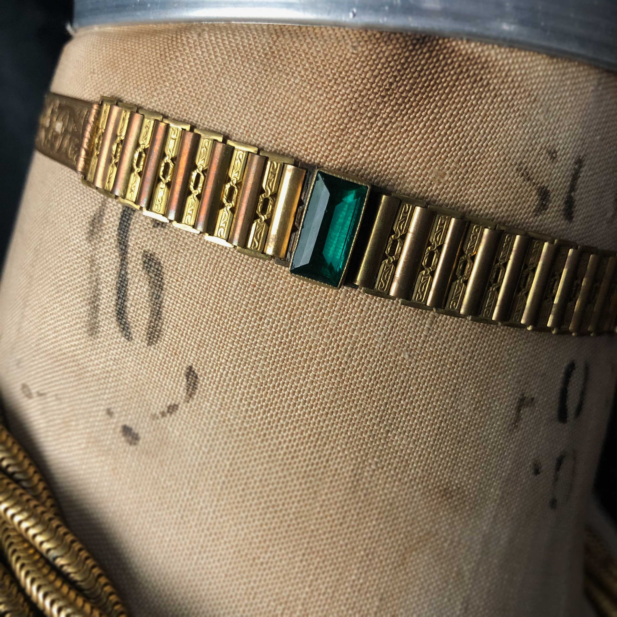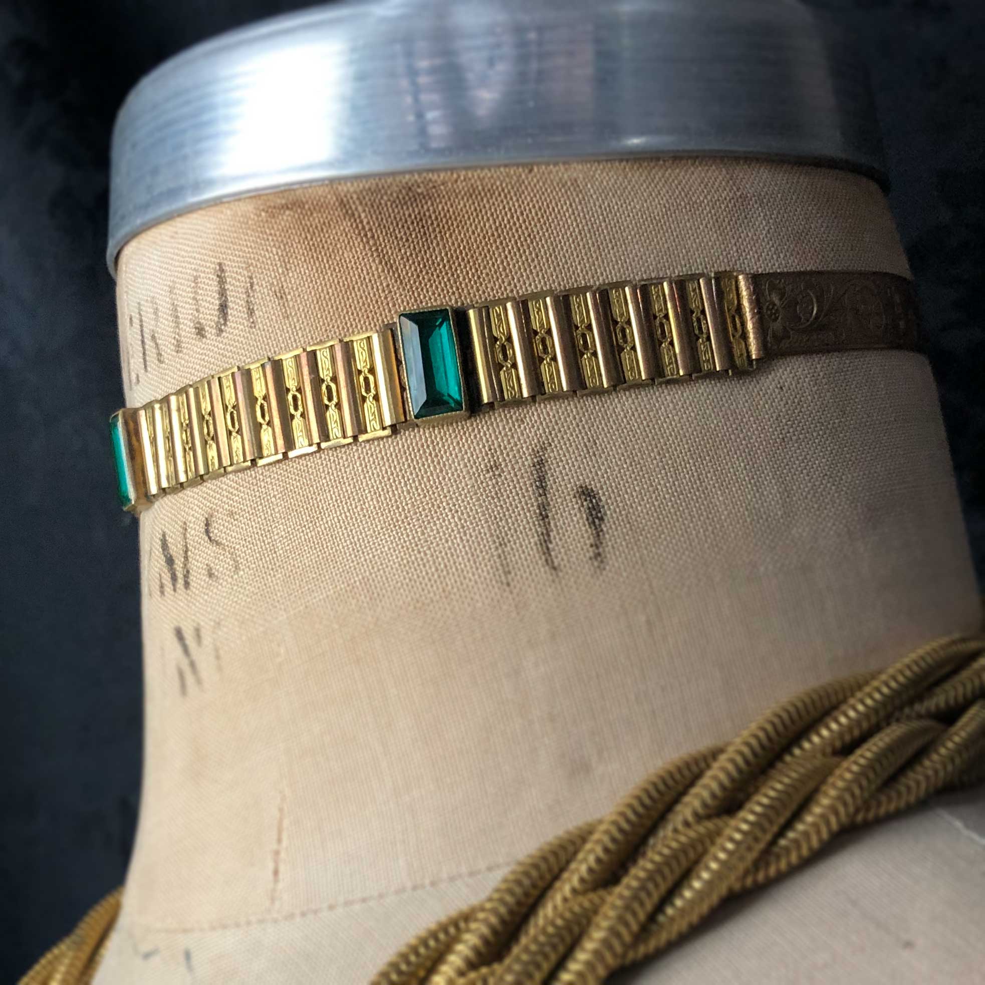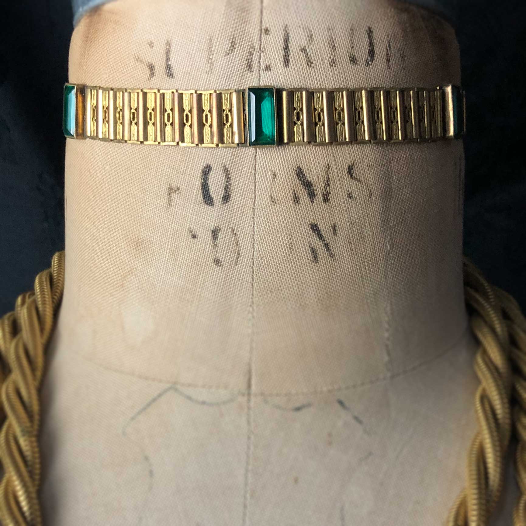 Three rich emerald green baguette cut crystals dot ornate bookchain links, with a stunning etched floral band and charming buckle closure. Layer with other antique chains for a dramatic tiered neckmess.