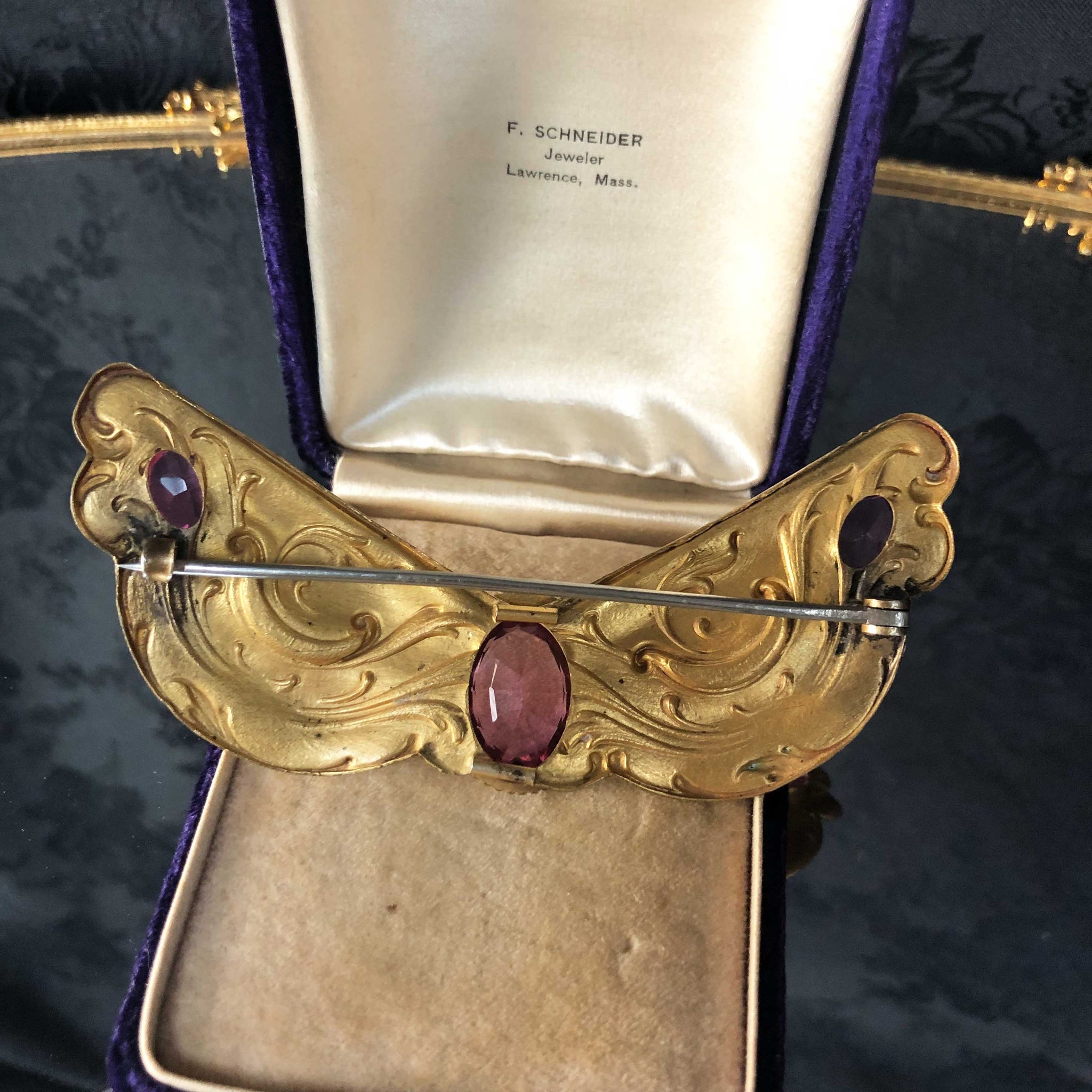 Gilt metal and glass. Unknown maker, made late 1800s to early 1900s. Measures 4" wide, set on a thick 3 inch pin, with round hinge and C clasp. Minor signs of age. Lovely condition with stunning brightness and sparkling stones.