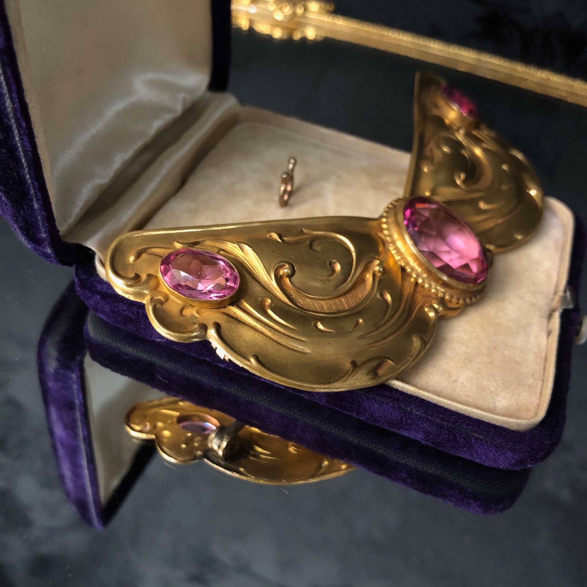 Inspired by butterflies and winged creatures, this Victorian sash pin embodies the spirit of gossamer beings. Wispy scrolls echo breezy flight while fanciful pink stones sparkle with light and movement. A captivating work of art.