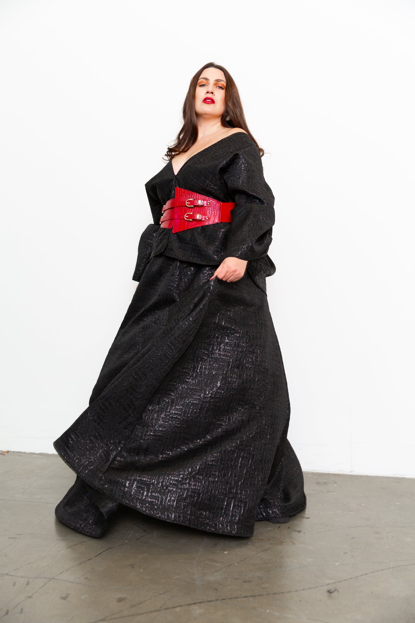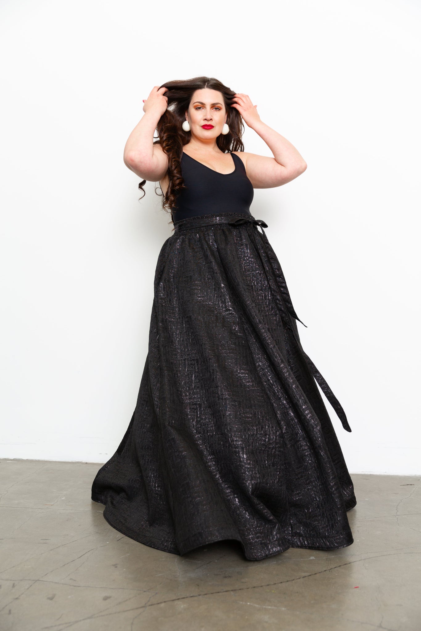 The orchestra is tuned. The audience is silent. You enter the stage and suddenly the crowd erupts into applause. Our new gorgeous skirts have been fit tested to fit divas sizes XS-4X with a luxurious smocked elastic waistband and dramatic panels of the finest jacquard in the world. Finishing off the details, you have a horsehair hemline to hold the shape of the skirt. Add a crinoline underneath for additional floof (sold separately). Pair it with matching outerwear for a showstopper moment.