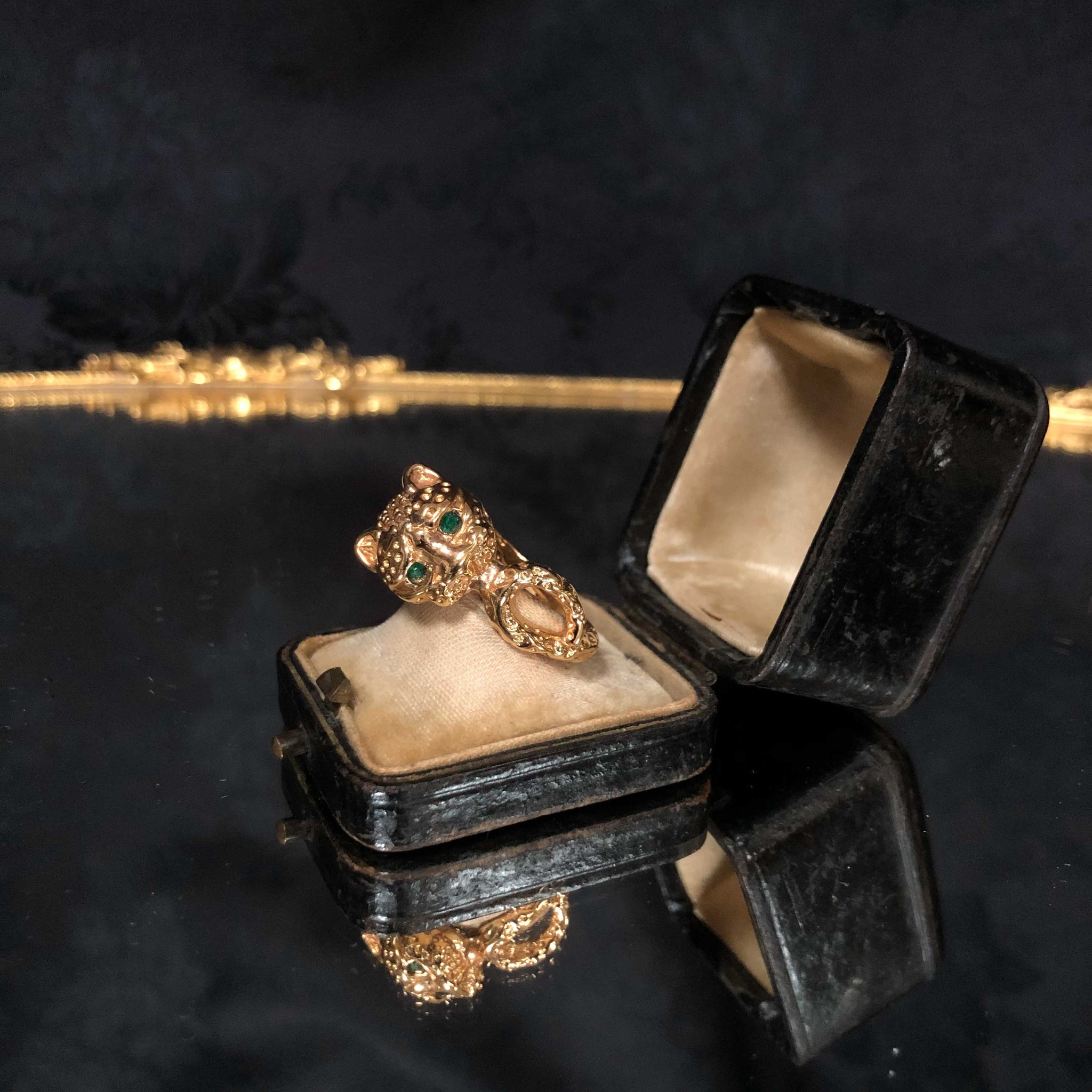 18K gold plated metal with crystals. Made by Avon. As new old stock, these rings are in near purrfect condition. Leopard texture with crystal eyes and mouth accents.