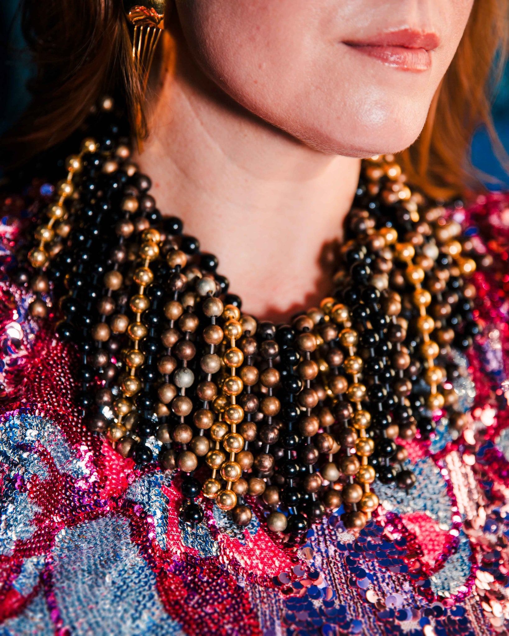 The dar brassy mixed metal finishes and vibe work perfectly with our Black Hole earrings and Tree Snake clutch.