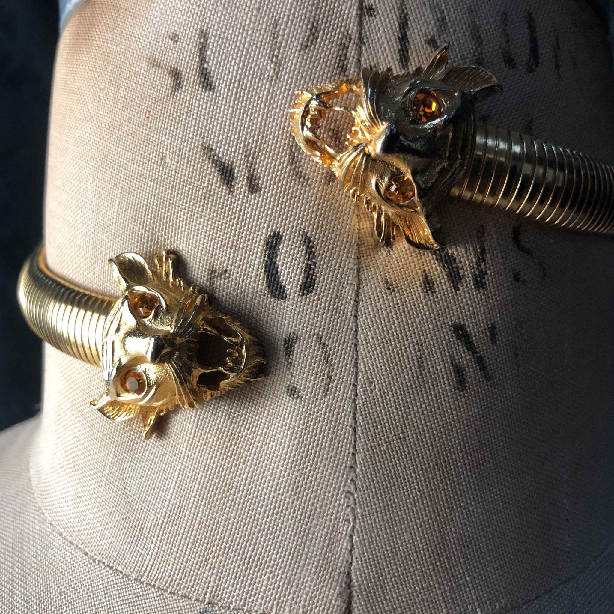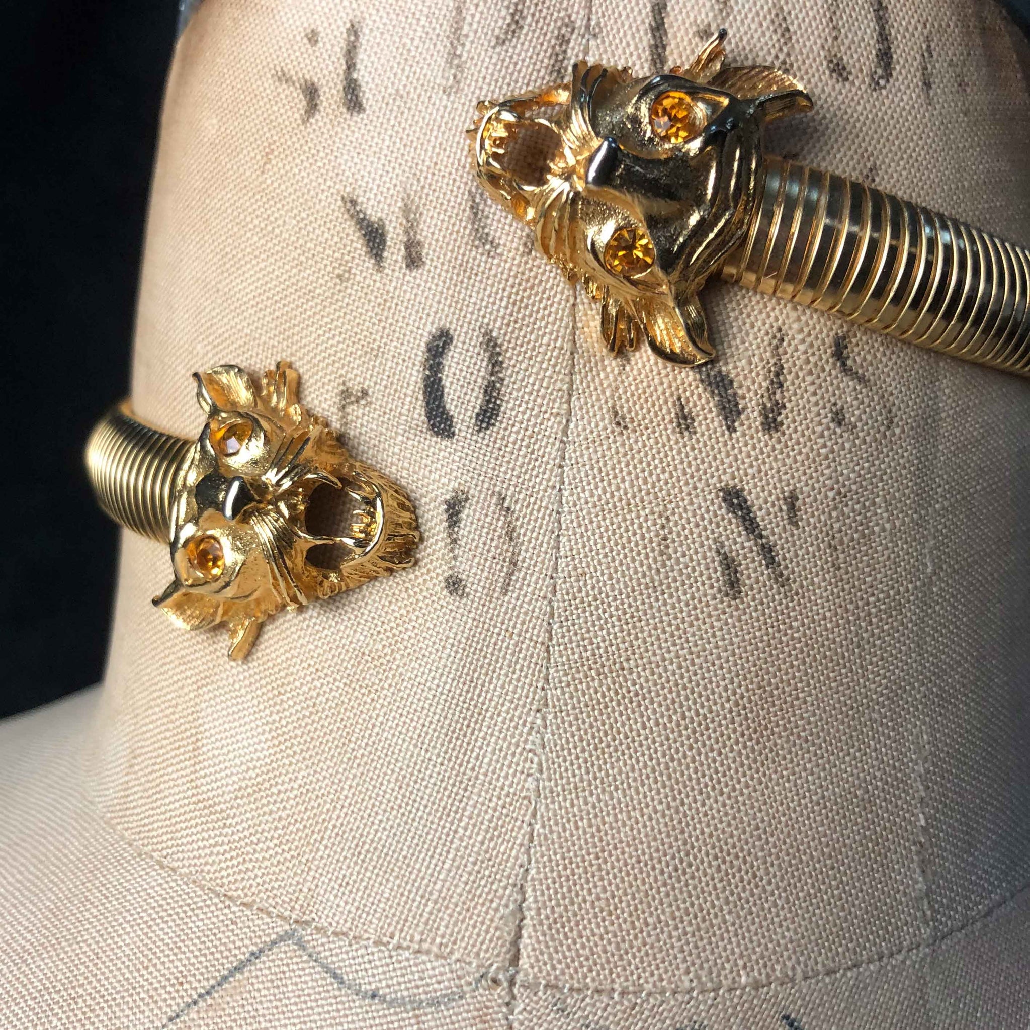 Vintage gold plated metal and crystals. Inner circumference measures 8" with stretch to 13-14 inches. Tiger heads measure approximately 1" across. Note: this is definitely a true choker; if worn stretched the fit is very snug.
