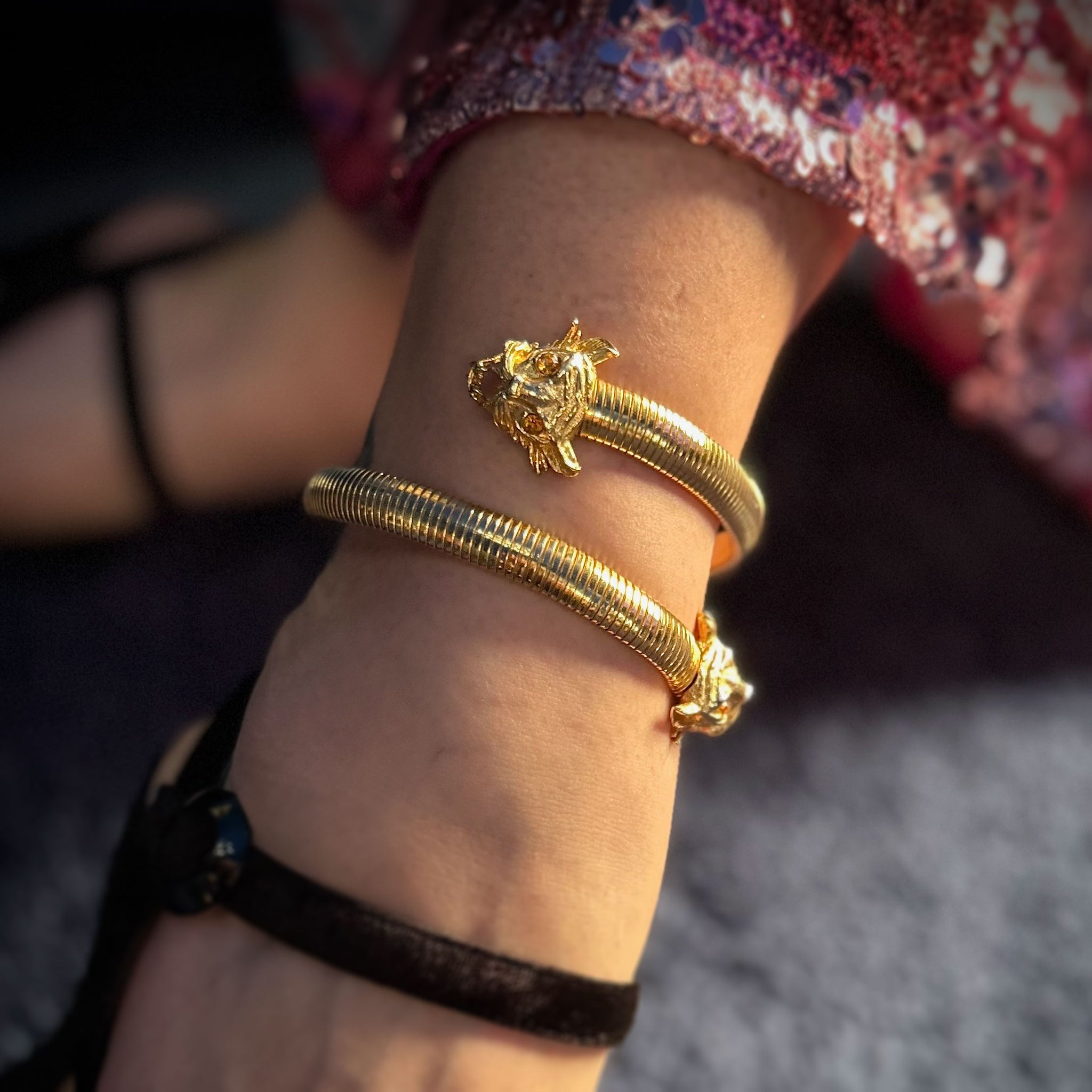 Screeching tiger heads accent the terminals of a coiled omega chain, with glowing eyes that pierce dark shadows - and even sharper teeth to pierce your enemies. Wearable as a leg band, upper arm band, or a choker if you dare!