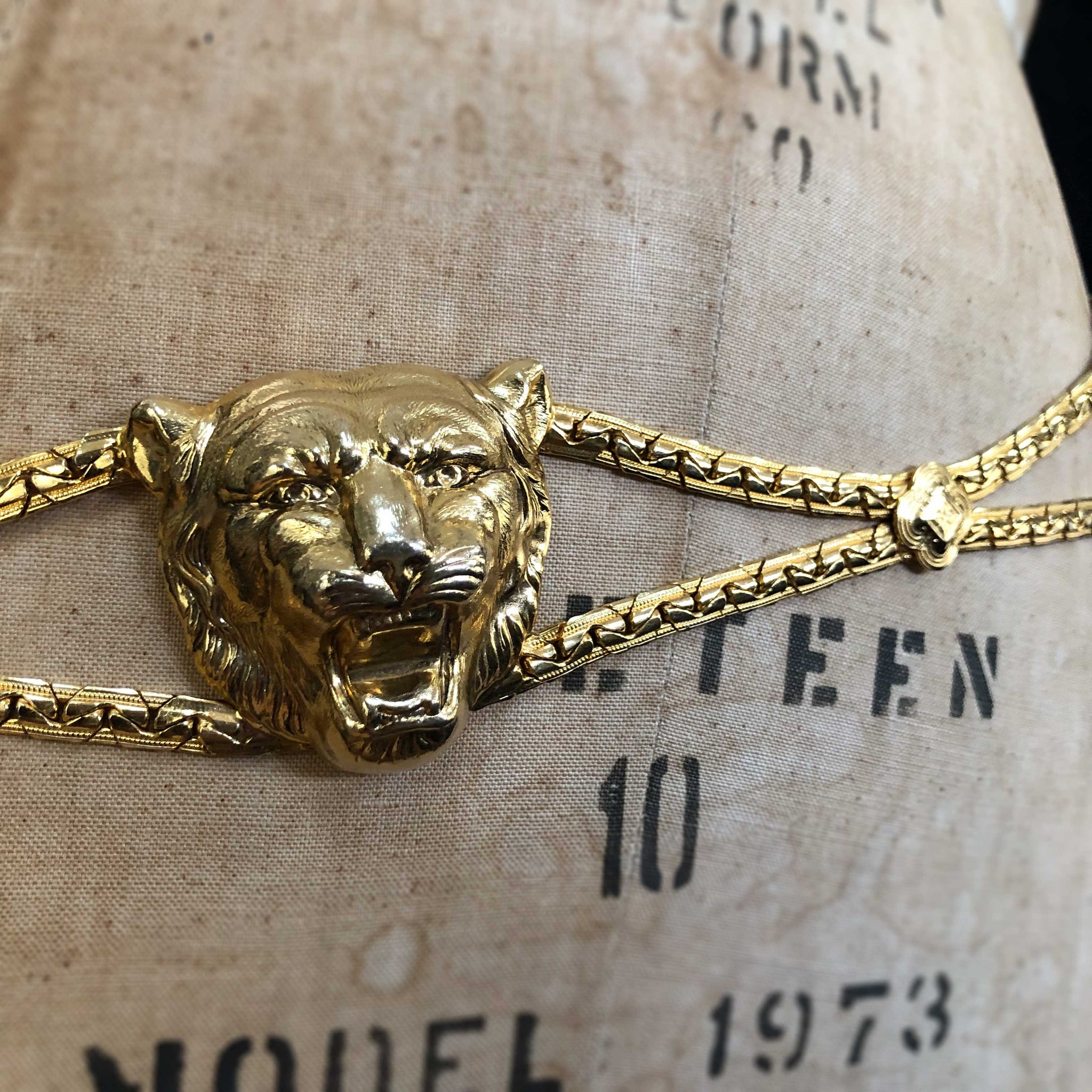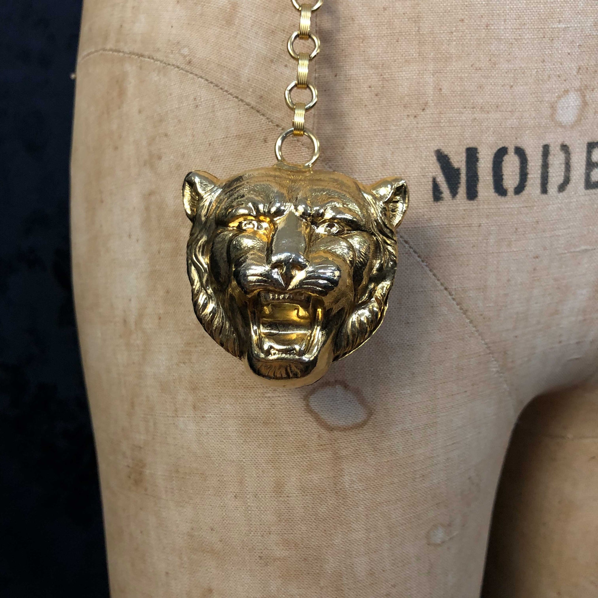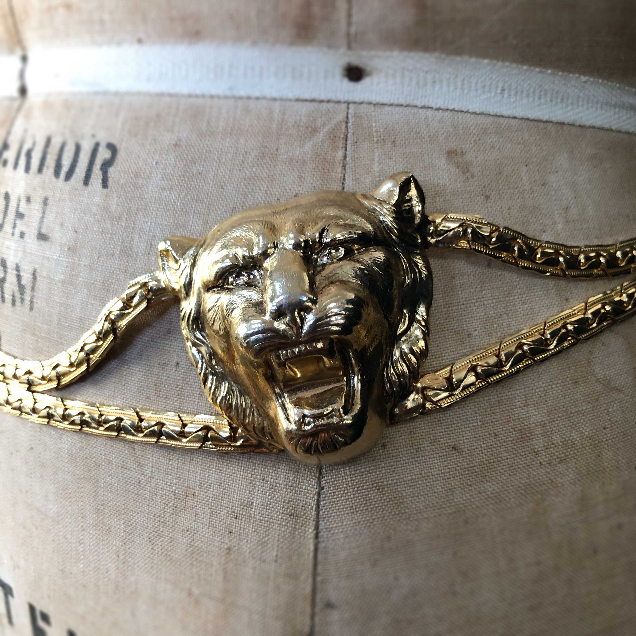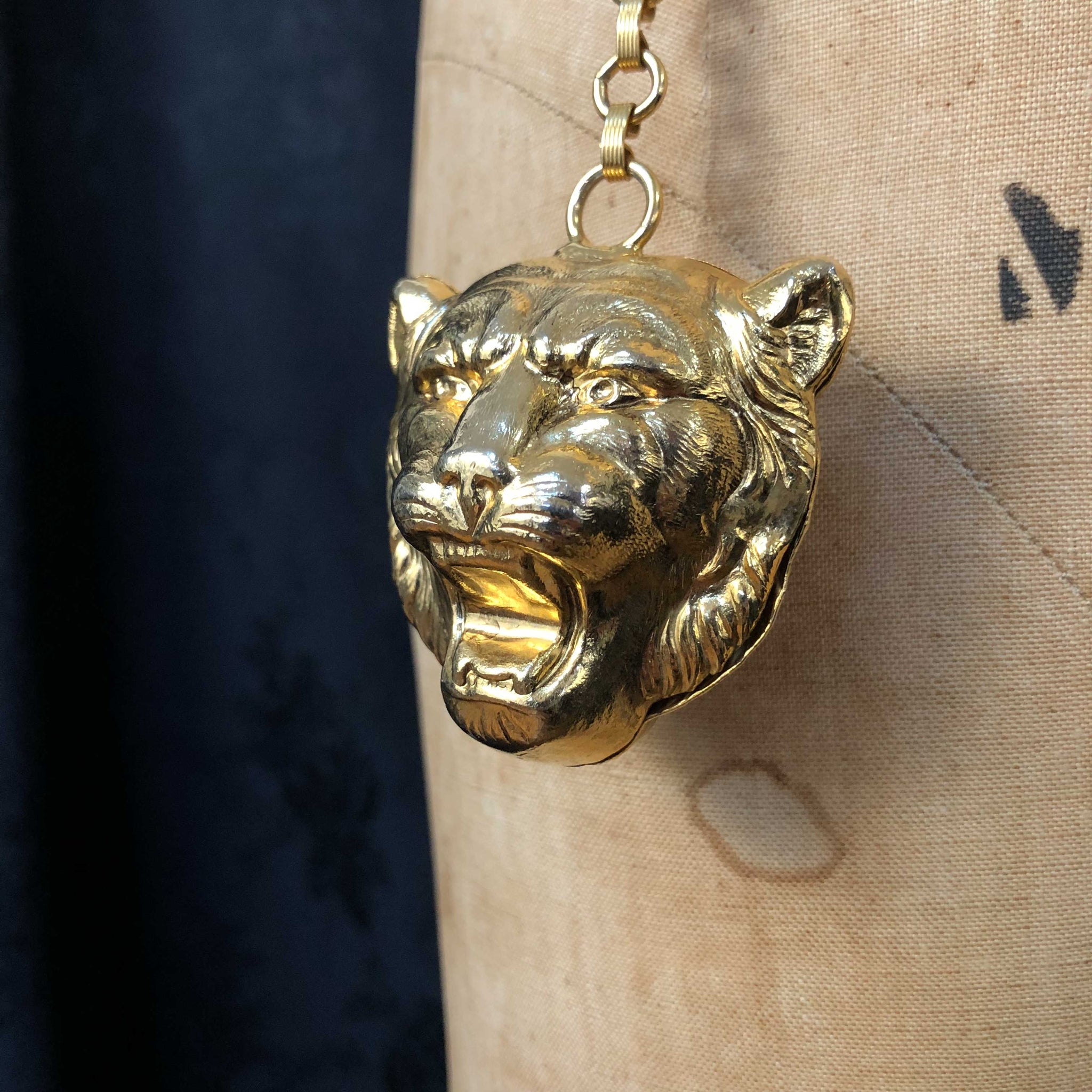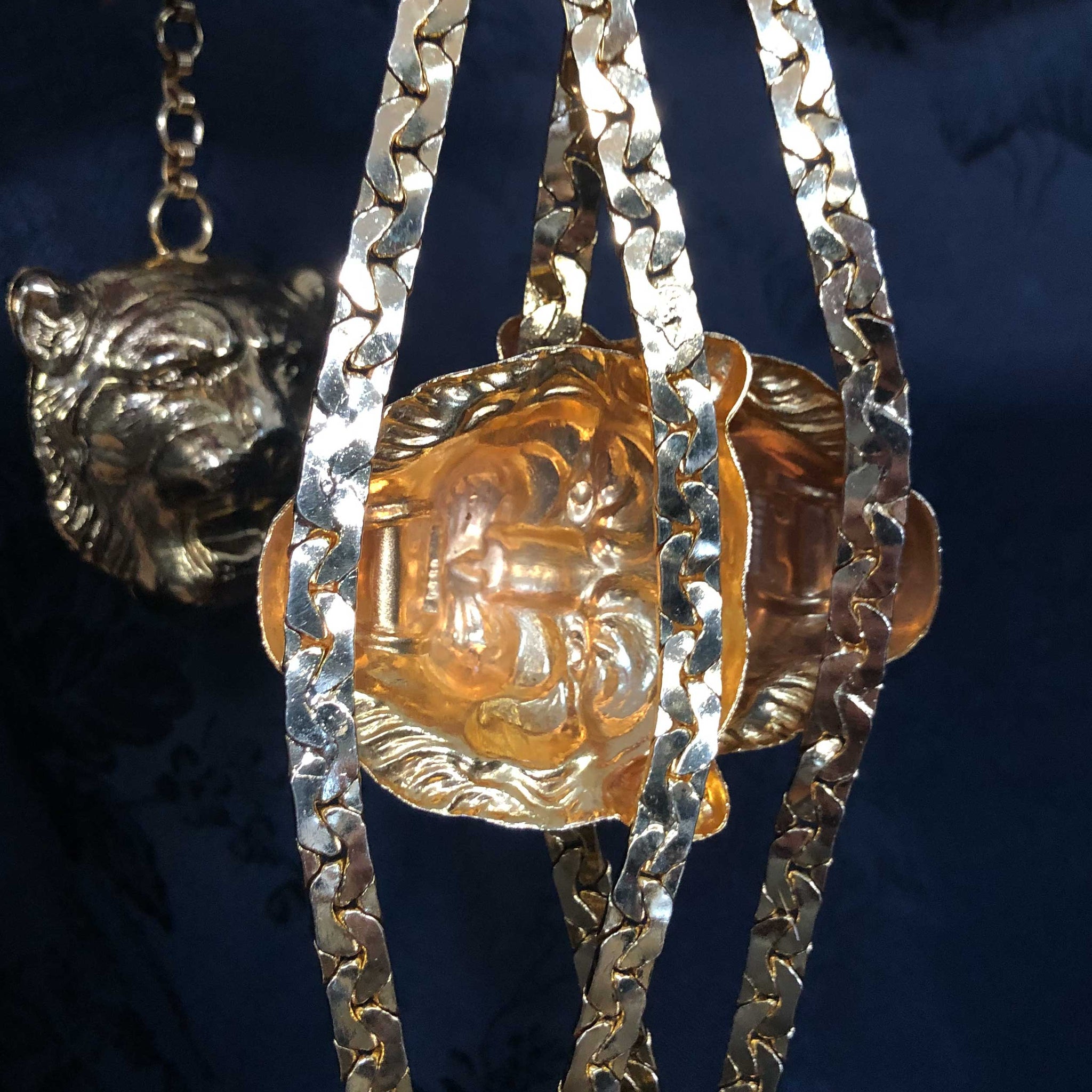 Ferocious 3D tiger faces dot this luxurious chain, linked with Dior-style medallions. A dangling double sided mama tiger roars from the end.